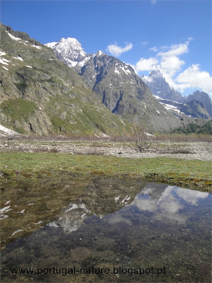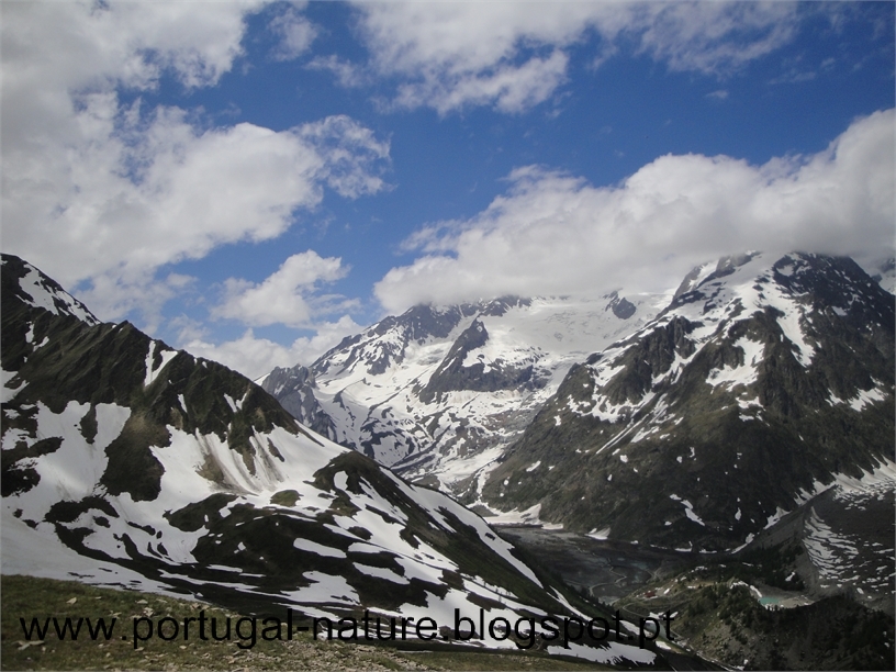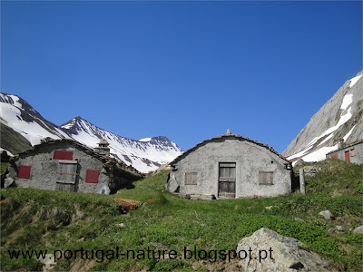 Já na estrada e com o Lac de Combal à nossa esquerda tínhamos duas opções, seguir em frente e percorrer o Vale Veny e descer por estrada até Cormayeur, optámos por virar à direita e seguir a rota principal que sobe a vertente para percorrer o Val Veny pela cumeada, passamos em alguns abrigos abandonados(Alpe inf. de L`Arpe Vielle) e continuamos a subir até um outro abrigo(Alpe sup.) de onde víamos o Glaciar do Miage em toda a sua extensão, por ali almoçámos, já os cumes esses estavam escondidos nas nuvens.