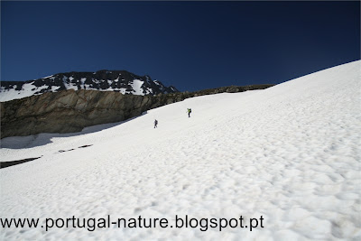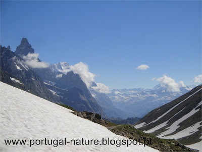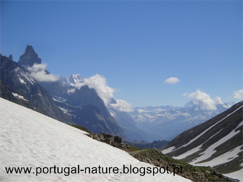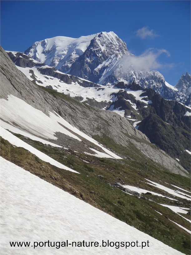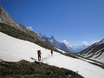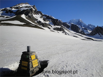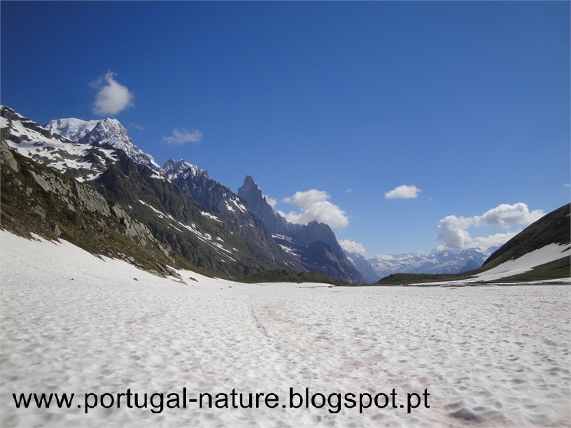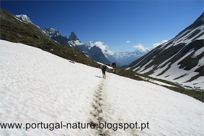 Começámos a subir tranquilamente e em 2 horas chegámos sem qualquer problema ao Col de la Seigne(2516m), fronteira França/Itália e seguramente um dos pontos altos, a todos os níveis, em todo o TMB, vistas brutais, Agulha dos Glaciares, Monte Branco, Agulha Preta de Peuterey entre outros. Por ali ficámos, seguramente, uma hora a apreciar e a gastar "rolo". Do colo descemos para o interior do Vallon de la Lex Blanche para Nordeste, naturalmente o trilho estava tapado com neve mas é intuitivo, passamos próximo do Refúgio Elisabetta(2200m) cerca de um hora depois de termos passado o colo e continuamos a descer até à base do vale em direcção a uma estrada e ao Lac de Combal.