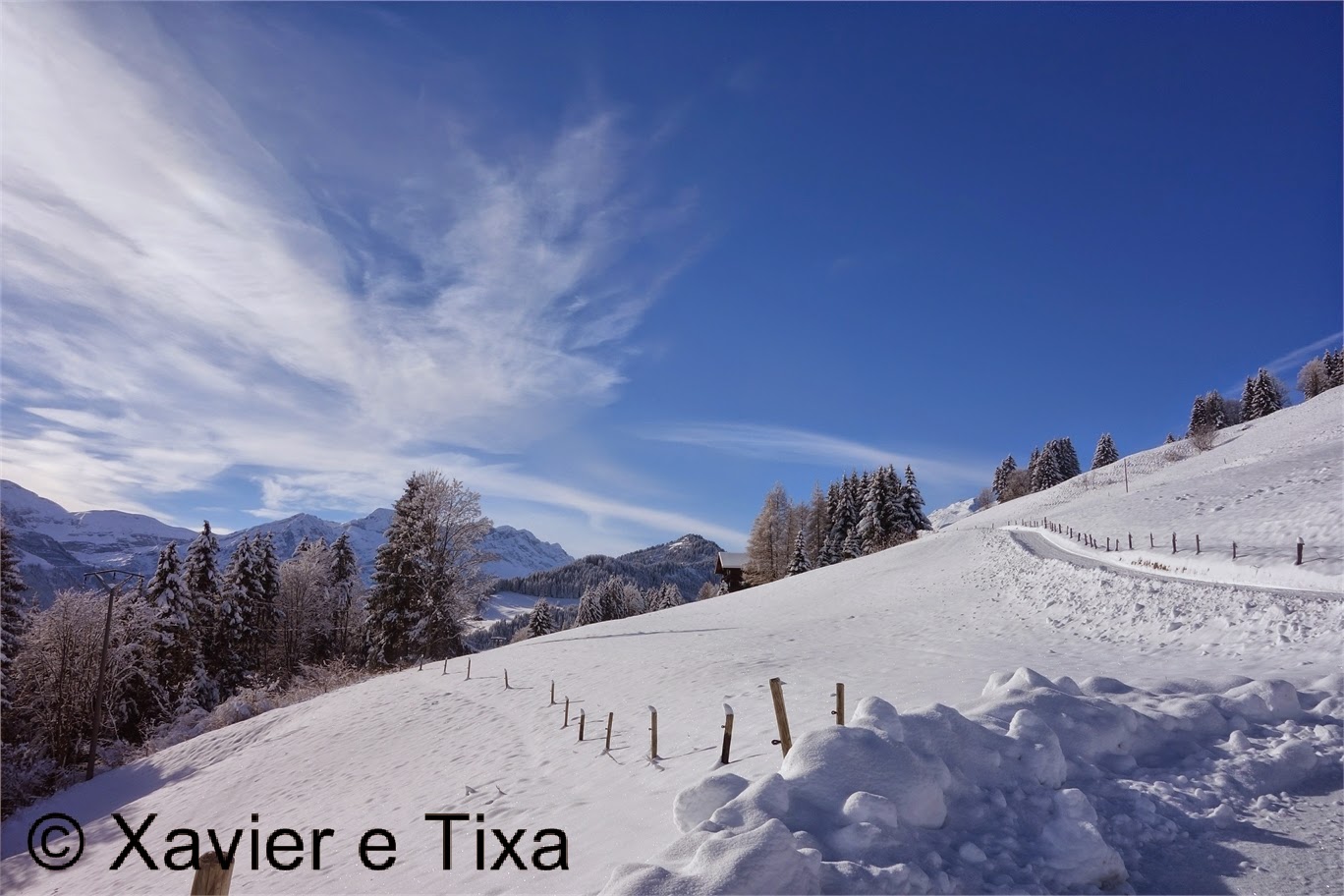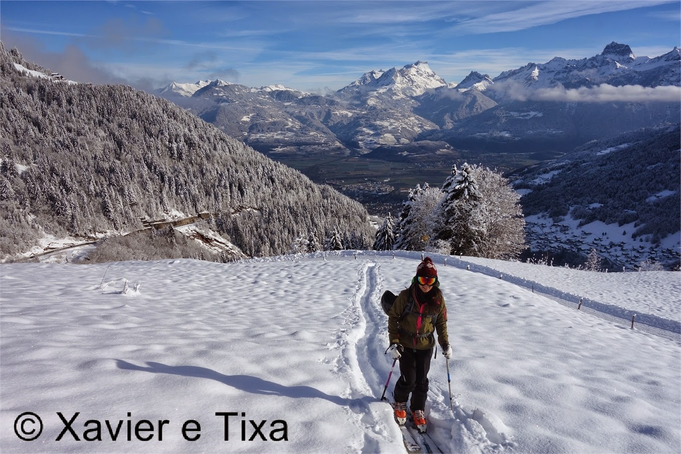 Partimos de Le Bois(1200m) entre Morgins e Troistorrents já com as peles de foca colocadas nos skis, após subir um pouco pelo estradão atacamos a encosta com sucessivos ziguezagues, bom para ir treinando as viragens.