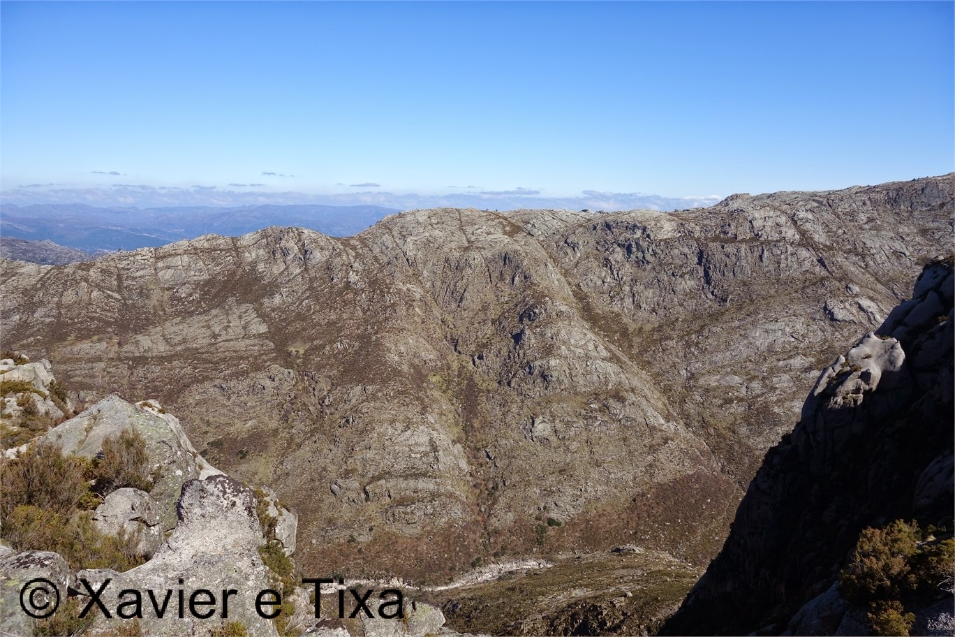 Ganhamos altitude rapidamente e nas nossas costas começa a ganhar dimensão a barragem de Vilarinho da Furna, a um ritmo tranquilo chegámos aos Prados Caveiros com umas 2h de caminhada, tomámos um reforço matinal e continuamos a subir rumo ao ponto mais alto do dia, o Cantarelo, seguindo por um caminho por vezes mariolado e jogando com a orografia do terreno apontando a uma grande rocha arredondada, tipo uma mariola gigante facilmente identificável ao longe, se bem que a deixamos de ver a determinada parte da subida. Chegados a este ponto estamos mesmo ao lado dos 2 cabeços facilmente atingíveis e sensivelmente com a mesma altitude, as vistas são abrangentes, Vale do Homem e o trilho da Encosta do Sol a Norte, continuando para Este seguem-se Modorno, Cidadelhe, Torrinheira, Iteiro d´Ovos, Mourisca, Rocalva, Albas, Carris de Maceira, Pé de Medela, Pé de Cabril, Louriça e bem mais ao longe serras do Soajo e da Peneda completam a vista 360.