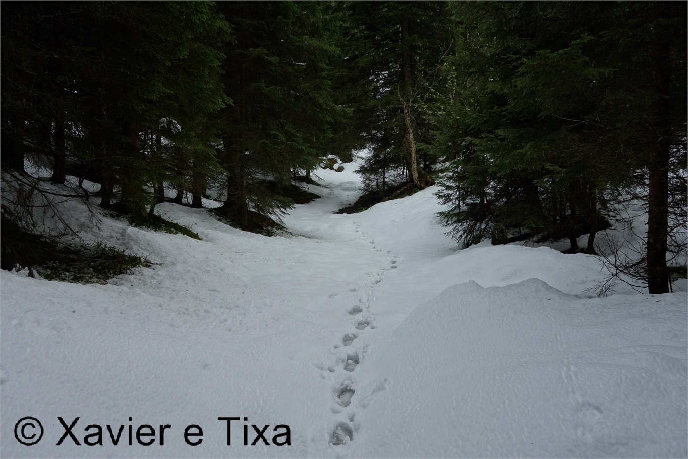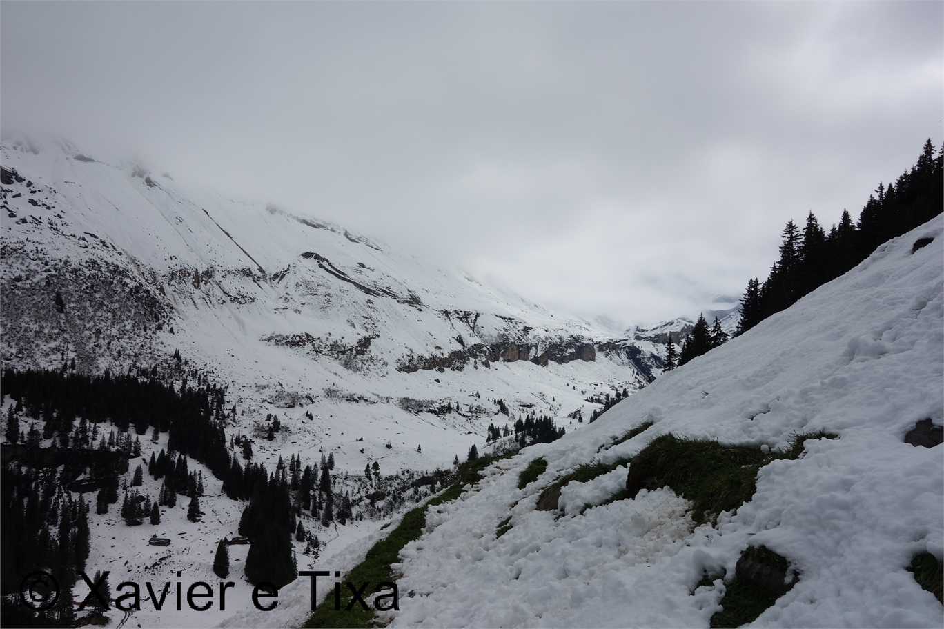 Ainda era cedo, repensámos o percurso e decidimos fazer uma volta circular apontando ao refúgio Lobhornhutte(1955m). Saídos do miradouro começamos por ganhar altitude à medida que vamos contornando a mesma encosta por onde tínhamos subida mas desta feita seguíamos uns 300m acima, seguimos sempre pelo interior da floresta até Souslager(1685m), altura em que a neve enterrava para lá dos tornozelos. Em Souslager voltámos a analisar a carta, passamos o rio Sous B e voltamos a ganhar uns 100m de desnível até Naterwengli(1776m),o trilho que fizemos visto da perspectiva que tínhamos antes de passar em Souslager tinha mau aspecto, parecia ter uma ou outra parte exposta e alguma neve, acabou por ser pacífico, em 2 ou 3 situações o trilho não era tão evidente umas vez que a neve tapava as marcações branca-vermelha-branca e a neve em certas ocasiões era até aos joelhos, certamente iremos repetir este trilho com melhor tempo.