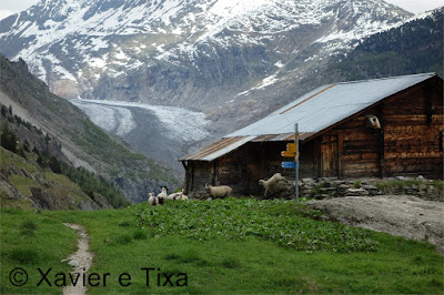 A partir do Aletschbord o trilho fica estrondoso, caminhamos na direcção do glaciar e descemos bastante, perdemos uns 550 metros de desnível até chegar à ponte suspensa, nesta fase em Oberaletsch fomos pastores durante uma meia hora, um grupo de cabras seguiu-nos durante uns bons 2km, de vez em quando davam-nos algum espaço como de repente corriam trilho abaixo na nossa direcção e nós quando parávamos elas também paravam e não nos passavam, a Xarah até estava um pouco assustada com o à vontade das cabras, vale a pena ver o vídeo.