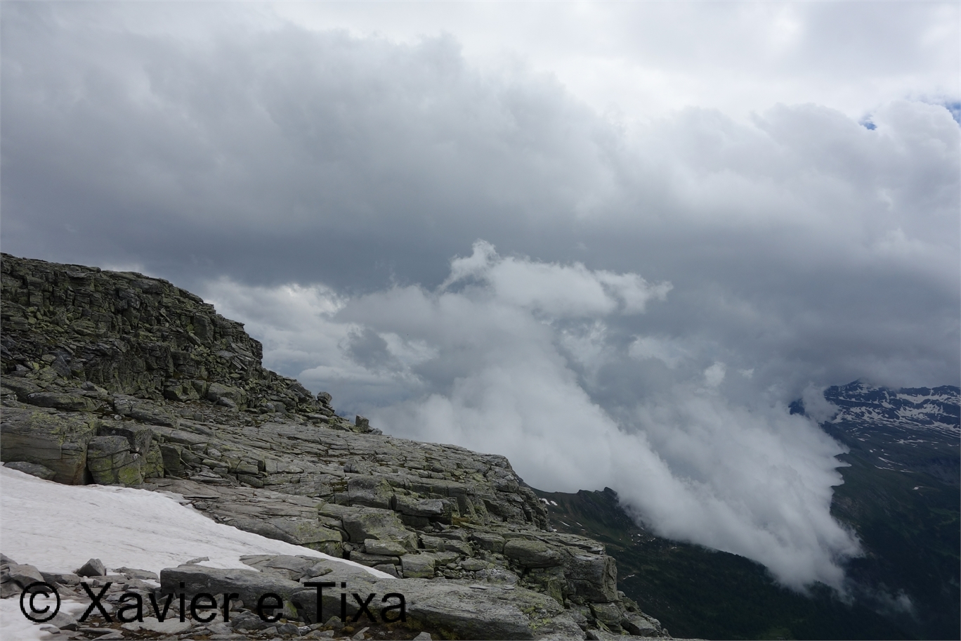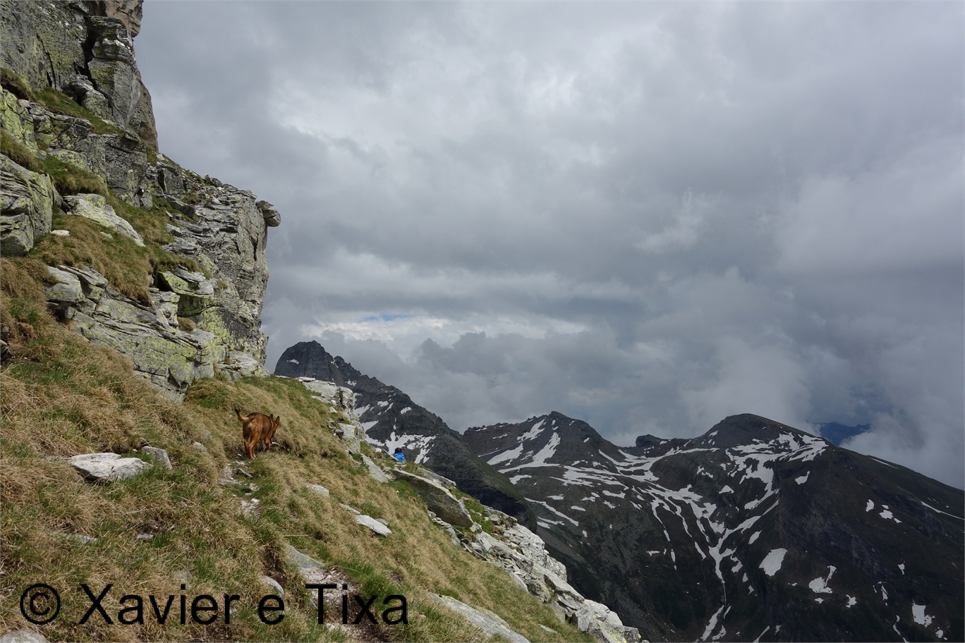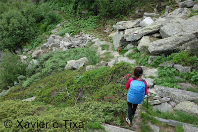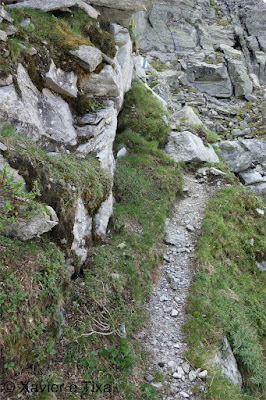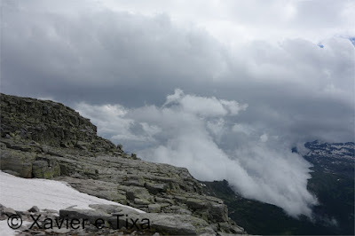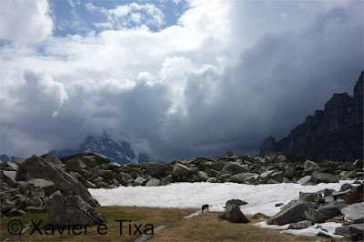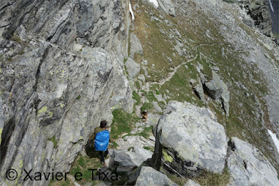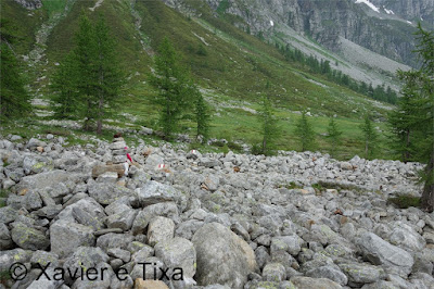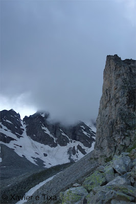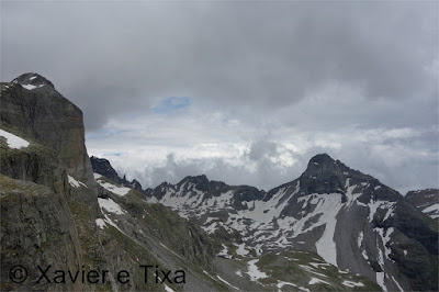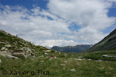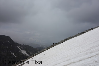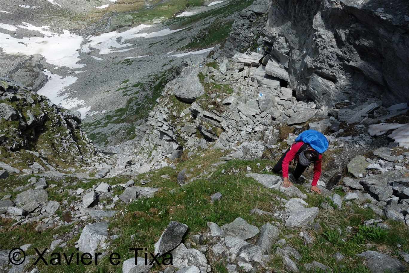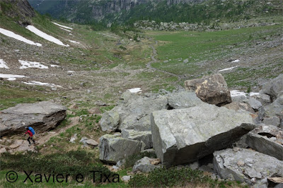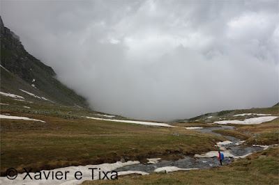 Uma meia hora depois e passadas vários secções com bastante neve chegávamos ao Ritterpass ou Passo di Boccareccio em italiano (2764m), colo fronteiriço. Neste ponto fiquei hesitante em subir ao Helsenhorn(3272m), parecia exequível, enquanto isso a Tixa continou a caminhar e começou a descer para o lado italiano, eram perto das 3 da tarde e ainda nos faltavam mais de 20km. Desci então atrás da Tixa e entramos em território italiano, numa primeira fase o trilho conta com cabos para ajudar na progressão, à medida que vamos ziguezagueando encosta abaixo o cenário vai passando de rochoso a alpagens, em Pian d'érbioi(2300m) aceleramos o passo, descemos directamente para Pian Sass Mor(2600m), altura em que voltamos a subir rumo a outro colo, o Passo di Valtendra(2431m), direcção E, na hora seguinte o trilho desce suavemente, entramos dentro de um pequeno vale, contornamos um lago a N, subimos uns 10 minutos até Scatta d'Orogna(2461m) e entramos noutro vale, seguiu-se uma longa descida até Alpe Buscagna(1967m) onde perdemos 500m de desnível, nesta altura o nevoeiro tomava conta da paisagem e só a espaços lá conseguíamos ver as montanhas que formam uma autêntica fronteira natural, para o lado italiano é tudo super escarpado.