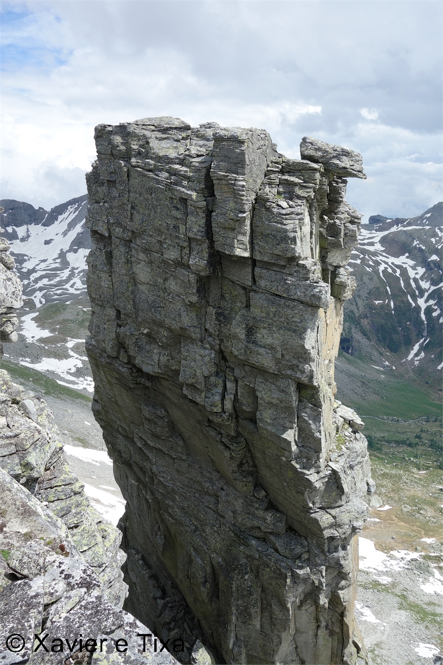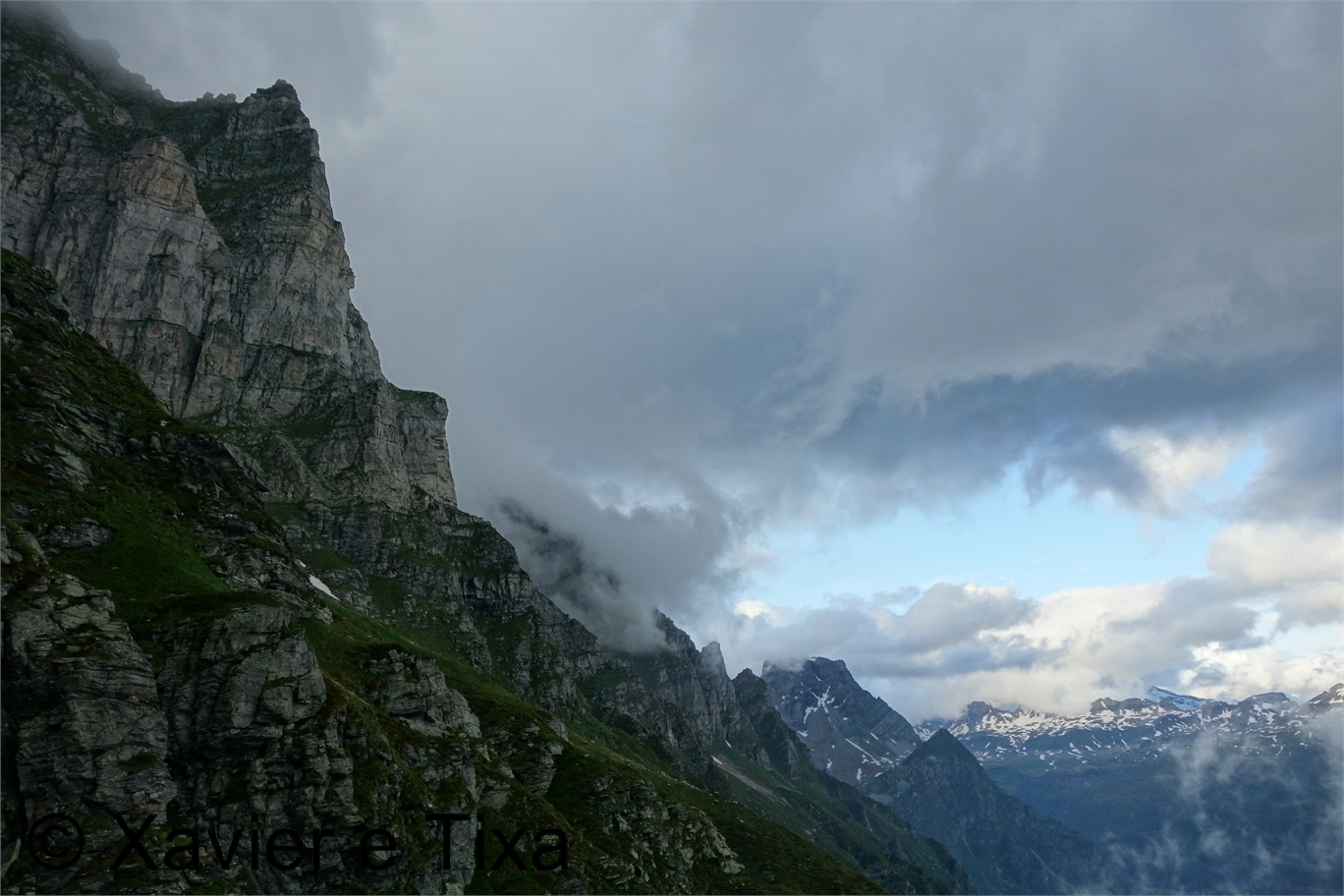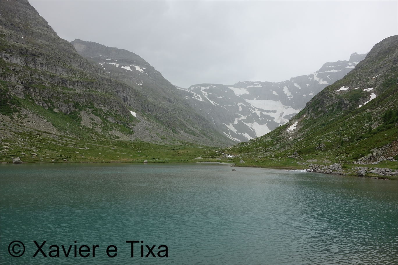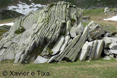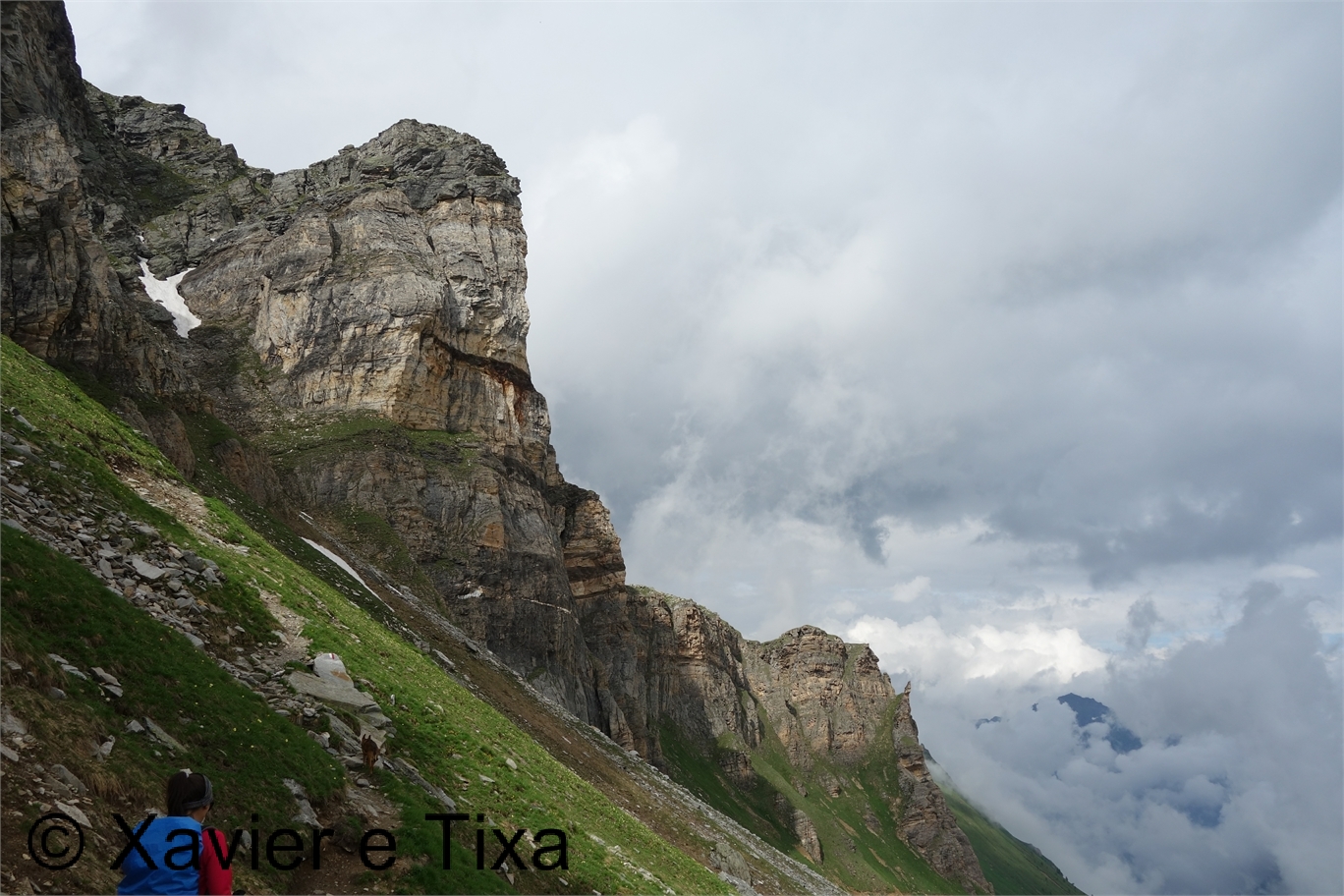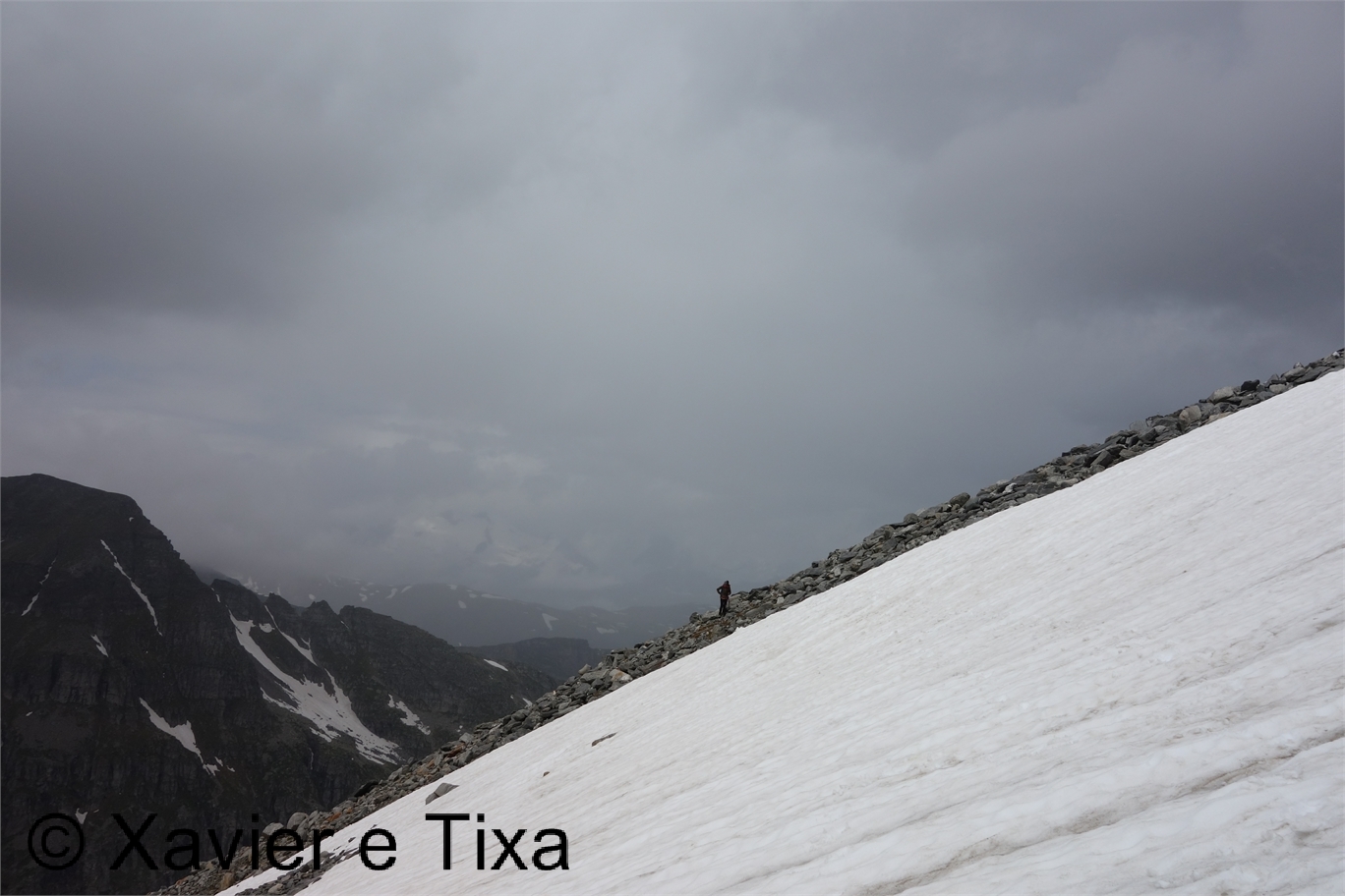 Uma meia hora depois e passadas vários secções com bastante neve chegávamos ao Ritterpass ou Passo di Boccareccio em italiano (2764m), colo fronteiriço. Neste ponto fiquei hesitante em subir ao Helsenhorn(3272m), parecia exequível, enquanto isso a Tixa continou a caminhar e começou a descer para o lado italiano, eram perto das 3 da tarde e ainda nos faltavam mais de 20km. Desci então atrás da Tixa e entramos em território italiano, numa primeira fase o trilho conta com cabos para ajudar na progressão, à medida que vamos ziguezagueando encosta abaixo o cenário vai passando de rochoso a alpagens, em Pian d'érbioi(2300m) aceleramos o passo, descemos directamente para Pian Sass Mor(2600m), altura em que voltamos a subir rumo a outro colo, o Passo di Valtendra(2431m), direcção E, na hora seguinte o trilho desce suavemente, entramos dentro de um pequeno vale, contornamos um lago a N, subimos uns 10 minutos até Scatta d'Orogna(2461m) e entramos noutro vale, seguiu-se uma longa descida até Alpe Buscagna(1967m) onde perdemos 500m de desnível, nesta altura o nevoeiro tomava conta da paisagem e só a espaços lá conseguíamos ver as montanhas que formam uma autêntica fronteira natural, para o lado italiano é tudo super escarpado.