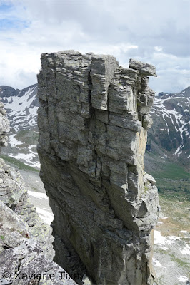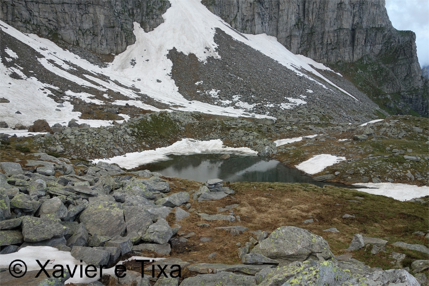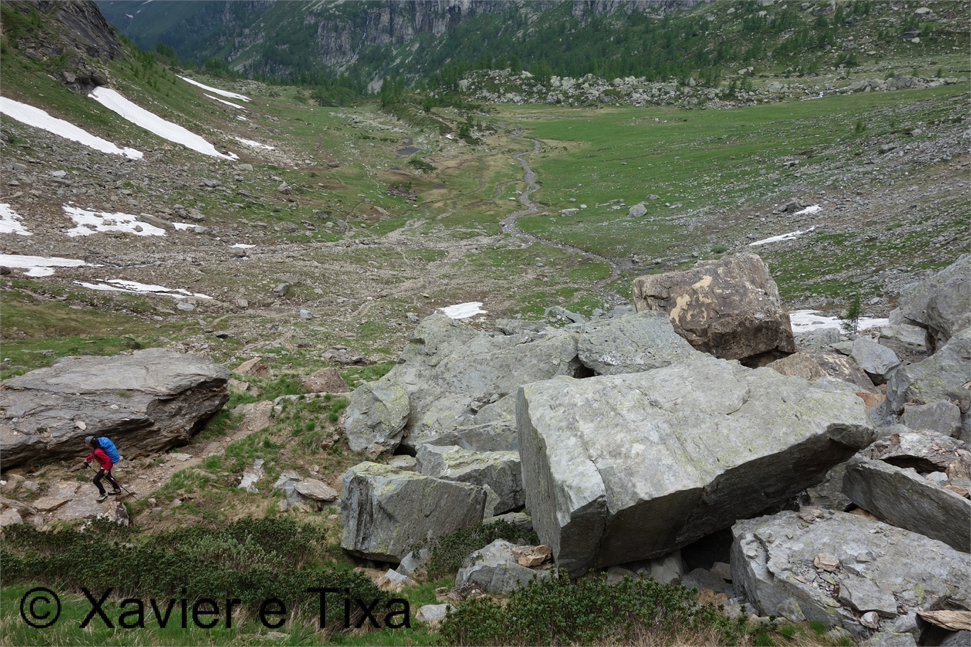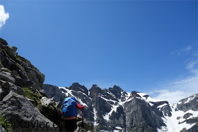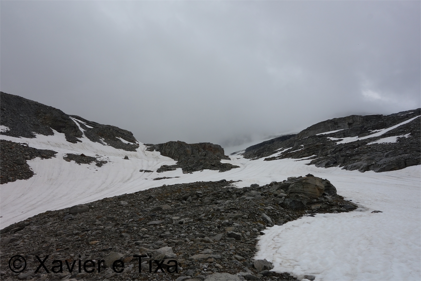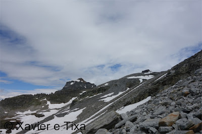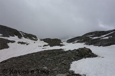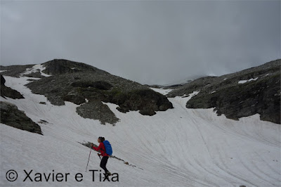 Em Bodi(1997m) trocamos de margem, flectimos para E/SE e continuamos a subir até à barragem em Einigehitte(2092m) onde começou a chover, contornamos o lago pelo lado direito e dirigimo-nos para S, só trocamos de margem perto do fundo deste belo vale(2141m), aqui já contávamos com o Sol e céu limpo, esteve um dia maluco, entretanto as marcas do trilho já são brancas e azuis, caminho alpino. Assim que trocamos de margem voltamos a subir e após ganhar uns 150m começam as coisas sérias, em várias partes temos que usar os 4 membros para avançar numa altura em que progredimos no meio do caos granítico, passada esta parte o trilho flecte para E à medida que vai contornando a encosta, pouco depois ficamos ao lado da principal linha de água, o trilho segue sempre próximo do rio mas tinha bastante neve, não gostámos do aspecto, vimos uma alternativa que foi continuar a subir para N evitando assim aquela parte, mas não podíamos fugir da neve porque até ao colo(2764m) iria estar bem presente, felizmente não estava gelada e não enterrava, estava óptima para progredir, sem ser preciso crampons.