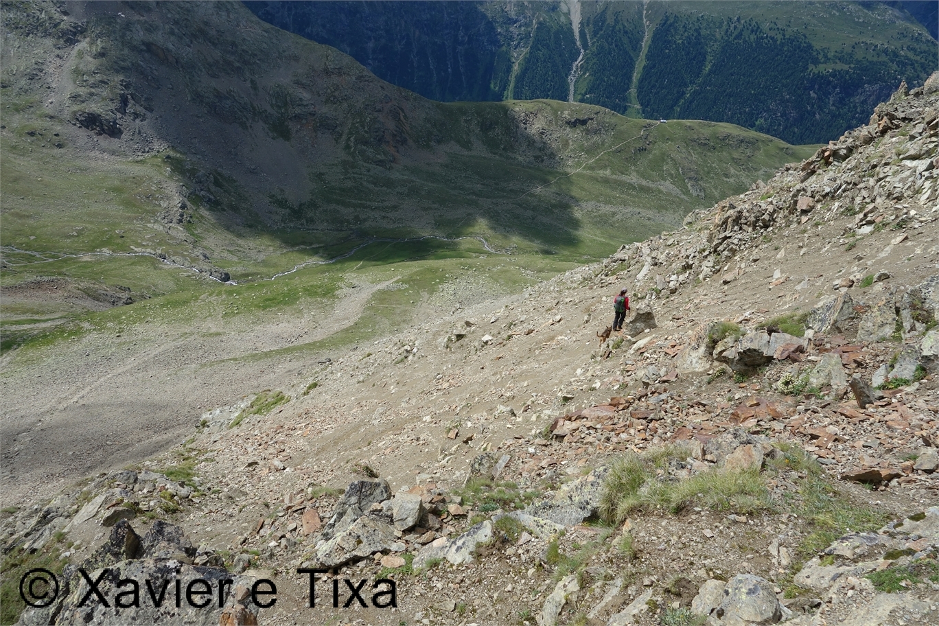 Iniciamos a caminhada por volta das 9h novamente no parque de estacionamento Diavolezza, passamos a estrada principal, uma ponte e continuamos para N, rumo ao interior do Val da Fain, seguimos sempre pelo estradão com o rio do lado direito até ao ponto 2172m, onde abandonamos o estradão e continuamos por trilho de pé posto rumo a NO/O, o trilho ziguezagueia encosta acima e ganhamos altitude rapidamente. Aos 2720m passamos num primeiro colo e a paisagem muda por completo, o verde dá ao lugar ao cinza, estava como o tempo que já ameaça chuva. Passamos ao lado de vários pequenos lagos e flectimos para O, poucos minutos depois passamos no Fuorcla Pischa(2840m), é verdade, Pischa, eheh!