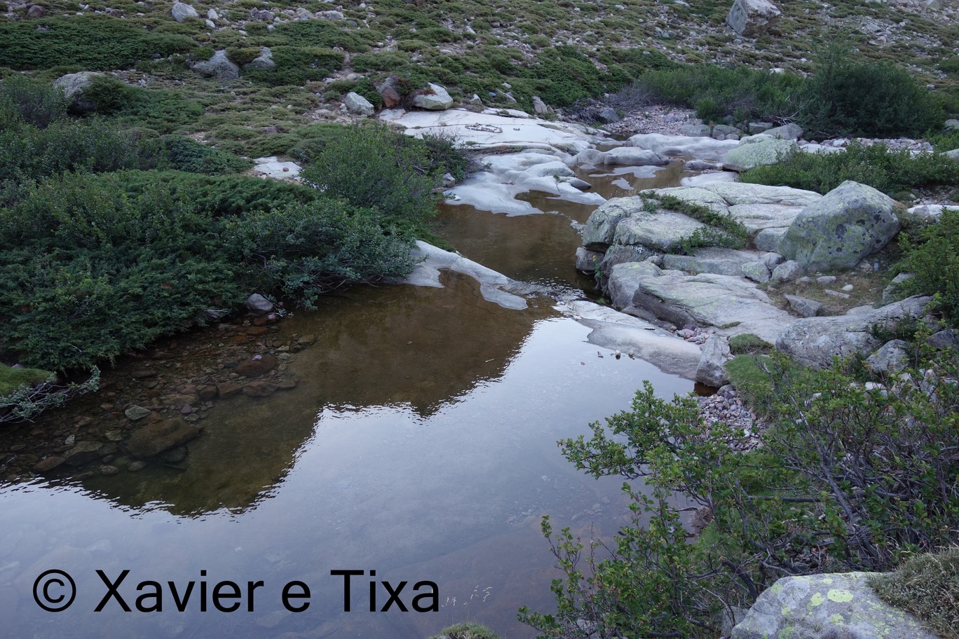 Do refuge Ciottulu di i Mori continuámos pela aresta a SO durante 1km até que descemos para base do vale, por onde andamos vários kms, passamos em belas lagoas, numa ponte e um pouco depois onde supostamente haveria uma segunda ponte, ela está lá mas encontra-se completamente destruída, felizmente o rio tinha pouco caudal pelo que foi fácil passá-lo, a paisagem nesta área é especialmente bonita.
