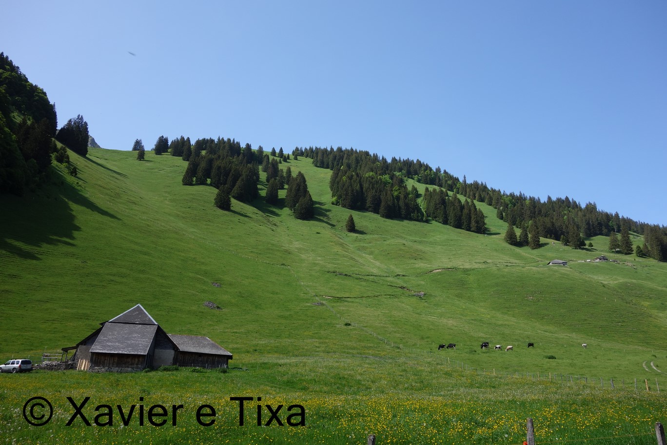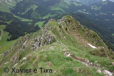 Começo a caminhada deste Domingo em Plan Carré(1142m), que acedi a partir de Albeuve. Subo para norte, passo ao lado de 3 chalets e uns 15 min depois passo em La Challa(1445m), uns 10 min depois continuando para norte passo em Gros-Moléson(1529m), aqui começa uma das partes mais interessantes do percurso, o trilho segue a meia encosta e contorna a face Sul do Moléson, chegado a uma bifurcação sigo as indicações Le Moléson, passo em Tsuatsau Dessus(1735m) e continuo a subir para Norte, rapidamente passo no colo(1919m) e faço uma rápida visita ao pico Le Moléson(2002m)