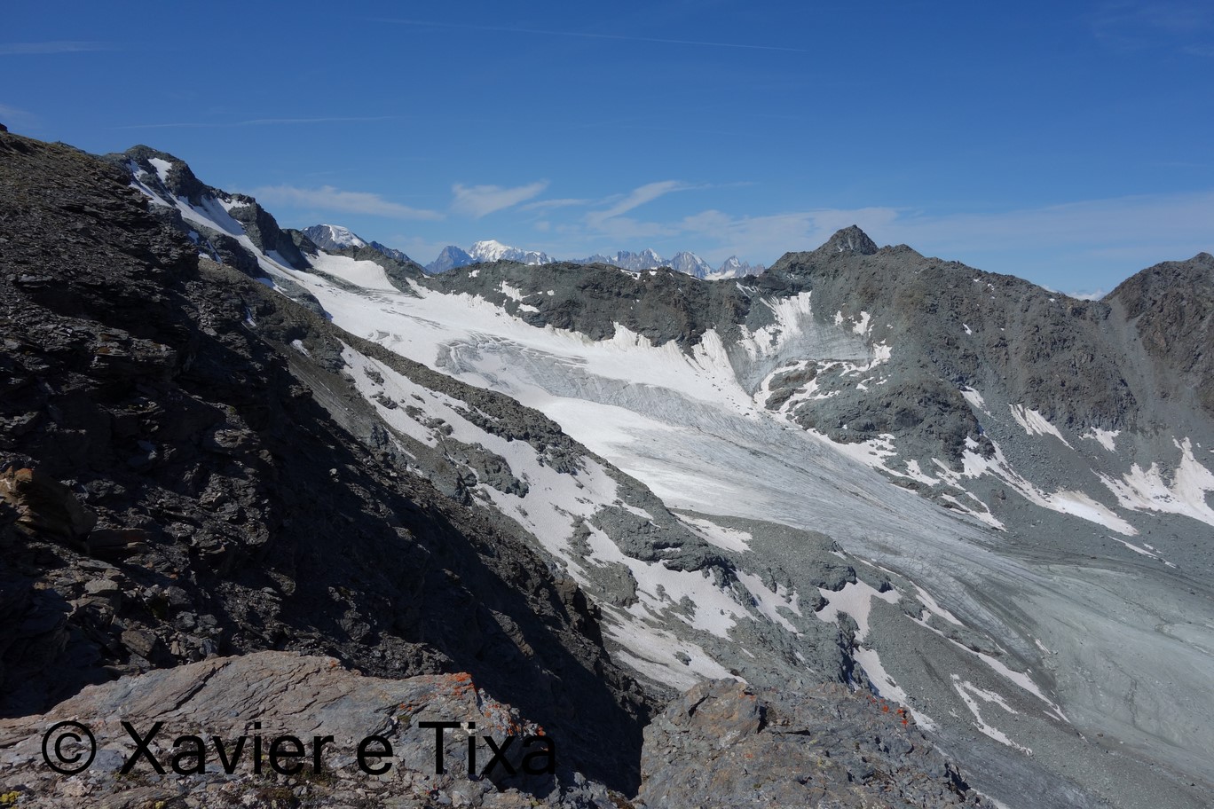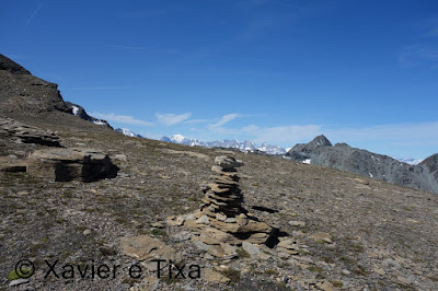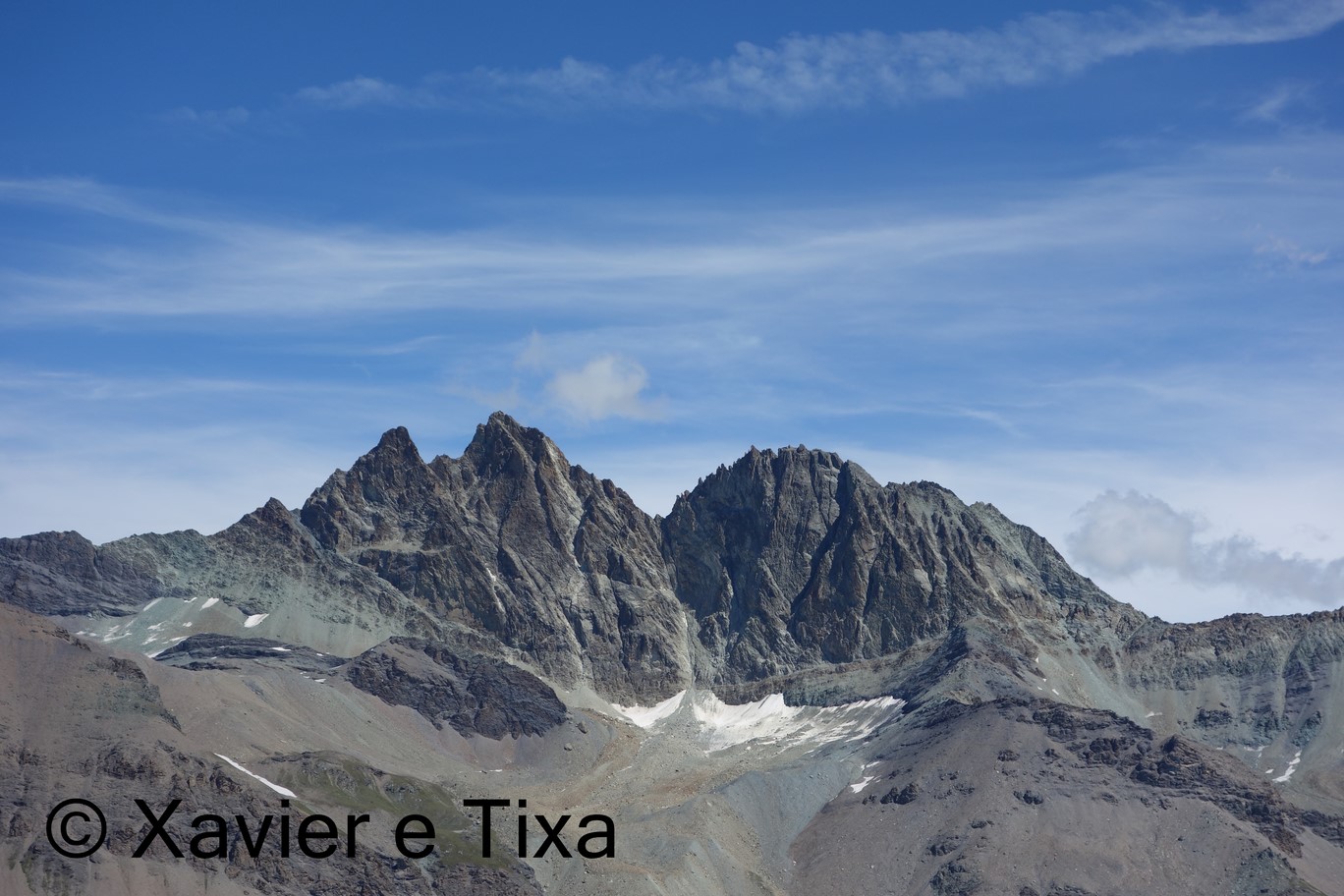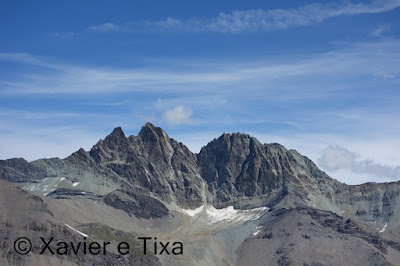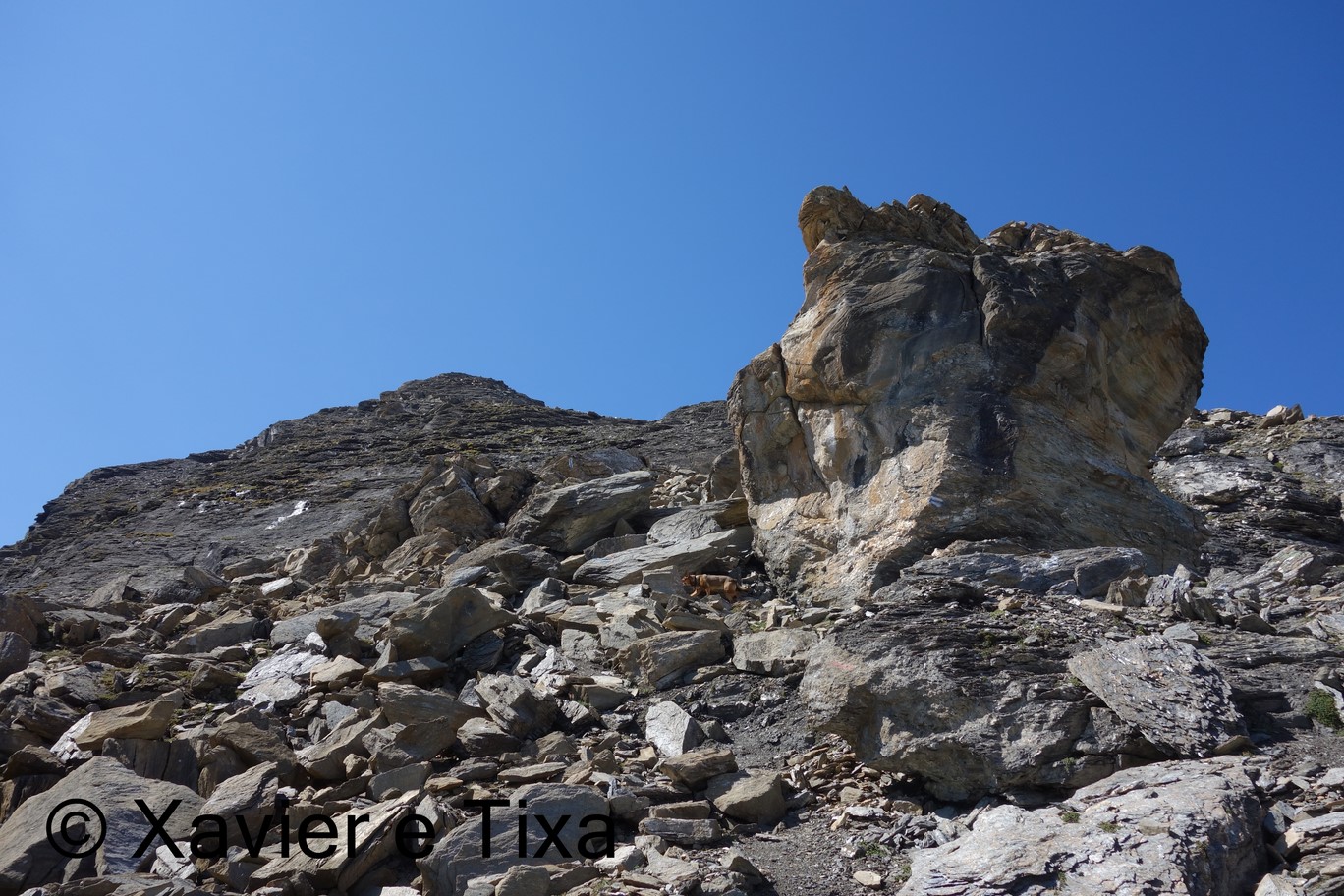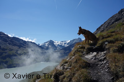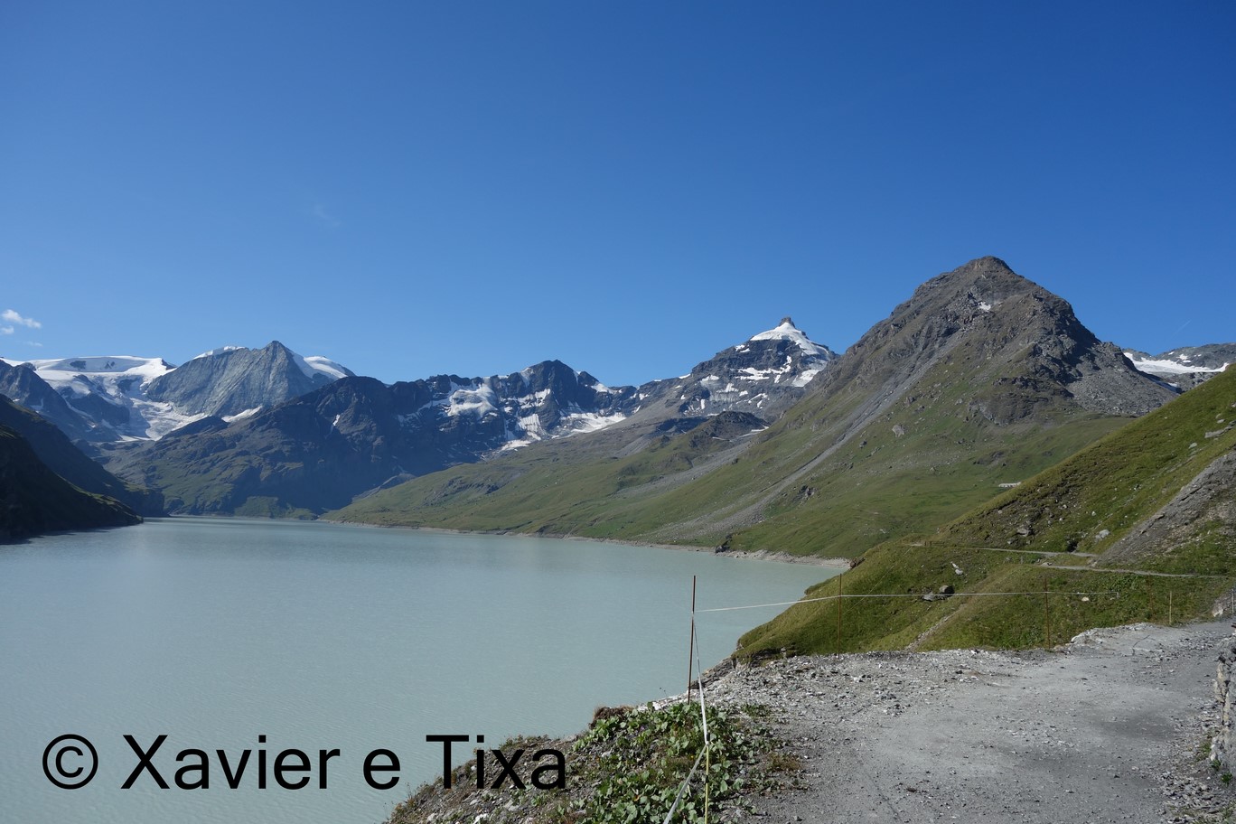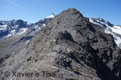 Começo por subir até ao muro da barragem, passo vários túneis, pouco depois passo em La Barma(24587m), aqui devia ter continuado pelo trilho marcado mas abandonei o trilho marcado para ir de encontro à aresta, contornei um pouco a encosta e lá encontrei as marcas azuis e brancas que levam ao refuge Igloo des Pantalons Blancs(3278m), o trilho sobe pela aresta sem qualquer dificuldade técnica até ao Rochers du Bouc(3314m), tem 2 partes com correntes mas são pouco expostas, a única parte técnica é a descida para um colo onde depois passa um pouco do glaciar e sobe para o refúgio, como estava com a Xarah não quis arriscar.