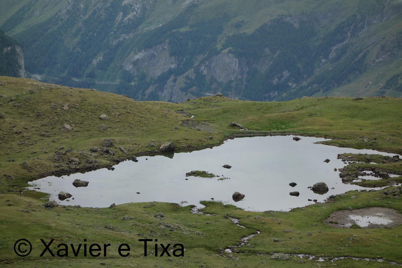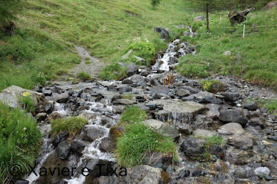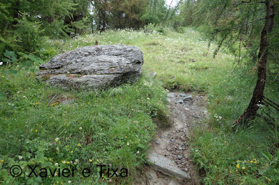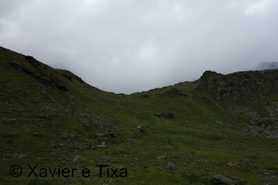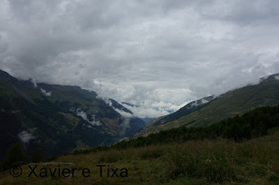 De La Forclaz sigo as indicações Col du Tsaté, subo um pouco por um caminho largo até que próximo de uma linha de água passo a caminhar em trilho de pé posto, passo em Tsaté, continuo a subir para Remointse du Tsaté, o tempo continuava muito nublado mas aguentava-se sem chover mas tinha a certeza que uma vez no pico não iria ver nada a não ser cinza à minha volta.