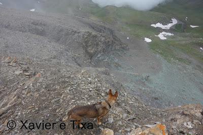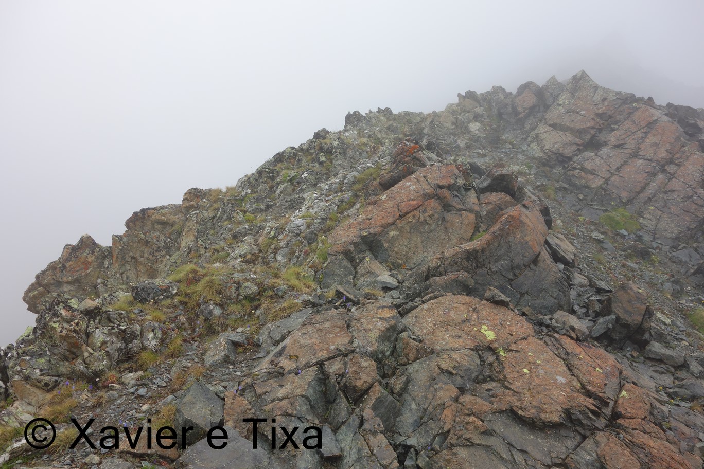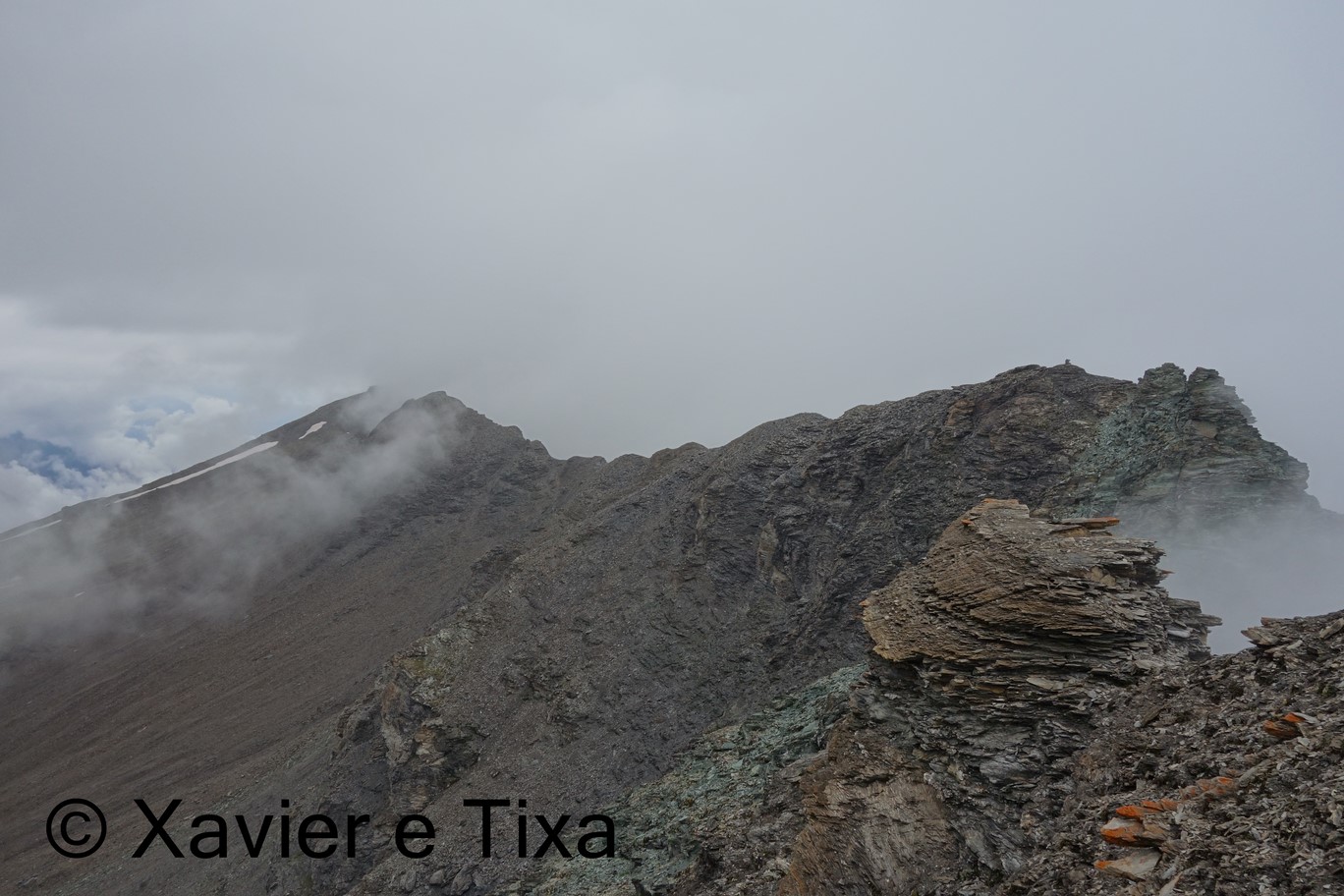 A aresta “termina” aos 3064m, num pico pouco individualizado, uns 100m a norte via umas mariolas num pico um pouco mais alto do que onde estava, deduzo que esse seja o Pointe du Bandon(3073m), do local onde estava era extremamente perigoso continuar para lá, existem vários ressaltos perigosos, a rocha estava molhada e estava com a Xarah, portanto fiquei por ali.