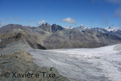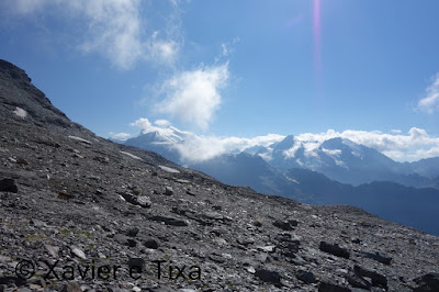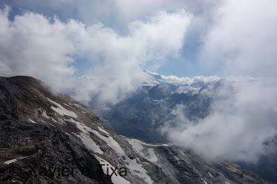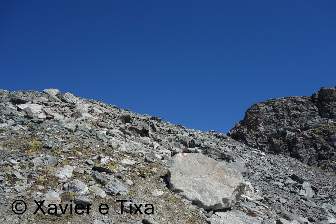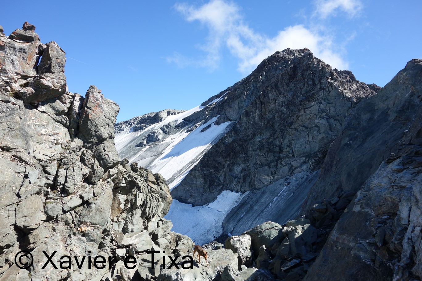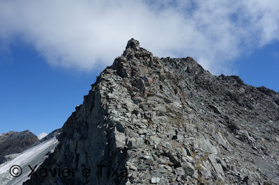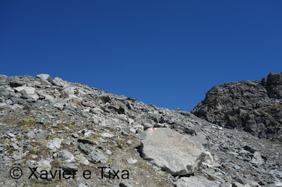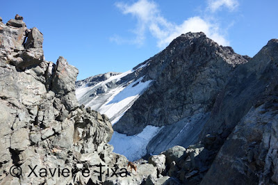 Do colo sigo para Sul, passo por escassos minutos no glaciar des Ecoulaies até ganhar de novo a aresta, entretanto existem vários passos de escalada, impossíveis ou extremamente perigosos para a Xarah, felizmente consegui contornar esses obstáculos passando pelo lado Sul da encosta, sem dúvida um sítio muito exposto à queda de pedras.