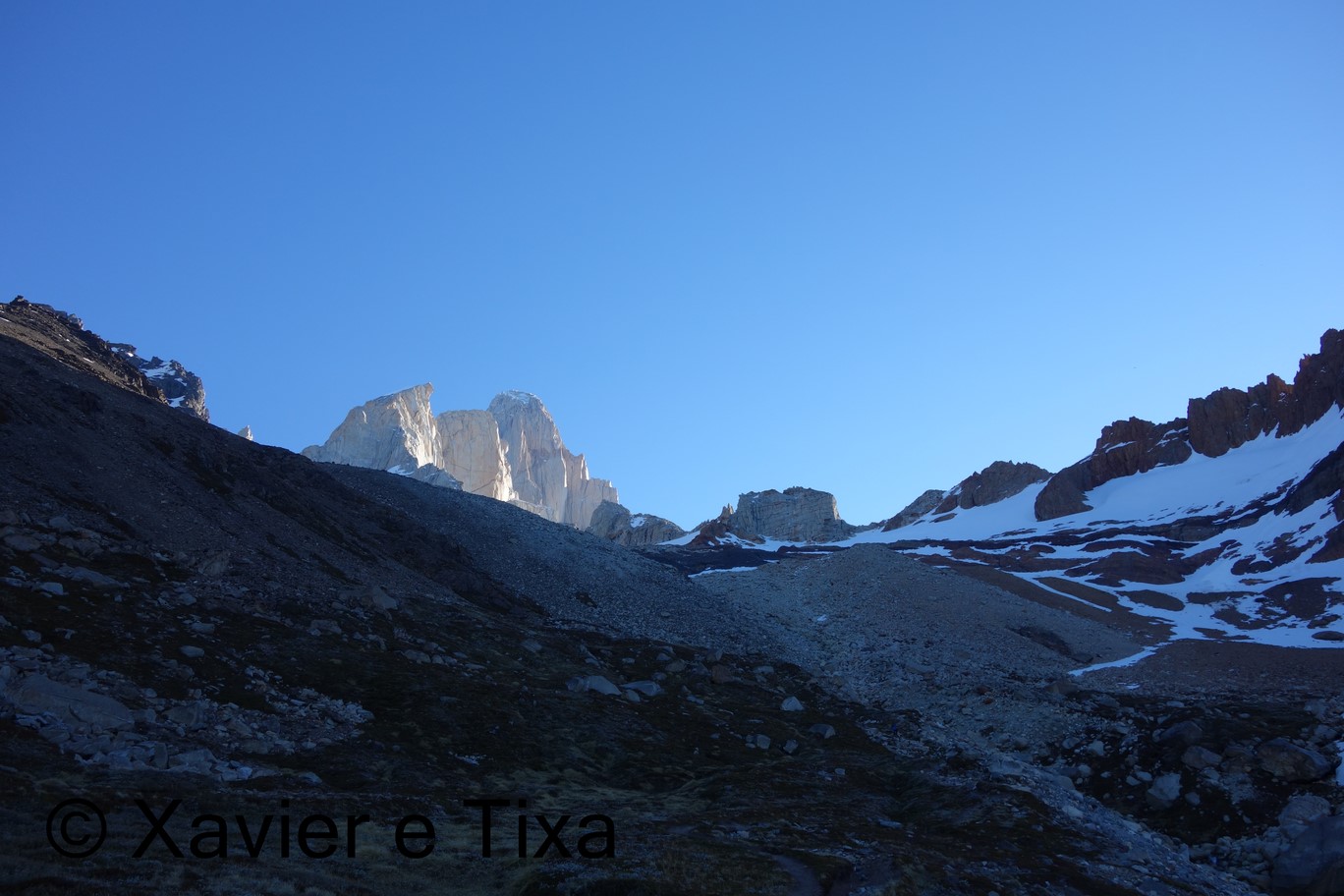 Com 3 horas depois de sair do Refúgio Piedra del Fraille chegava ao Paso del Cuadrado, um autêntico portal para a alta montanha, o cenário enche-se de agulhas graníticas e de glaciares, uma vista menos conhecida do Fitz Roy e do Cerro Torre, agora ter uma vista destas logo no primeiro dia não estava no programa, o céu continuava limpo e pude estar no Paso sem casaco o que calculo que seja raro.