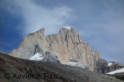 Deixámos a tenda, sacos cama e algumas coisas mais pesadas no refúgio e atacámos a íngreme subida rumo a Piedra Negra, ganhamos altitude rapidamente, passamos no lago já num ambiente completamente alpino, o lago estava gelado, deste ponto vê-se bem o Paso del Cuadrado e vê-se também o Fitz Roy com seu magnífico granito característico.