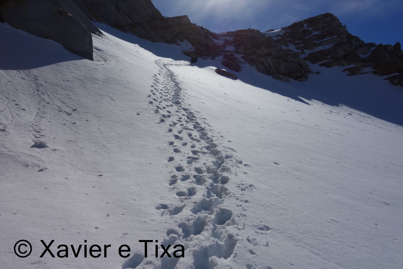 Contorno o lago pelo lado direito e subo em diagonal rumo ao Paso del Cuadrado, primeiro subo um rochedo seguindo mariolas e depois segue-se a neve, somente a parte final de 10m que antecede o Paso é bem íngreme e requer um pé alpino dependendo das condições.