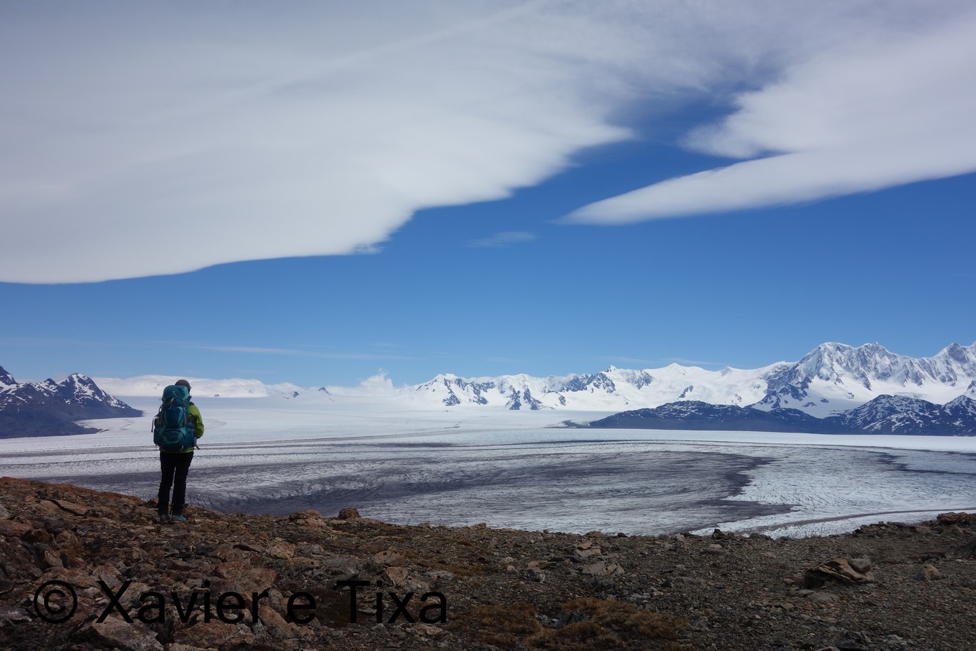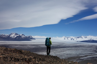Chegados ao Paso del Viento o cenário estava absolutamente mágico, algumas nuvens típicas da Patagonia, este era um dos momentos pelo qual aguardava, ter vista para uma parte do enorme Campo de Gelo Continental Sul, a maior massa de gelo depois dos pólos, que cenário! Incrivelmente não estava muito vento e pudemos ferver água com o fogão neste sítio o que penso que só é possível alguns dias por ano.