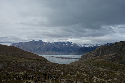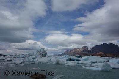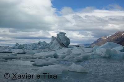 Pausa snickers e iniciamos a descida para a Bahia de los Témpanos, numa primeira fase desce suavemente, uma meia hora depois eram visíveis uma quantidade enorme de icebergs perto da Bahia de los Témpanos, parei para analisar a carta e para meu total espanto percebi que íamos dormir mesmo ao lado dessa praia, não queria acreditar!! Não fazia a mínima ideia que íamos dormir num sítio assim durante todo o percurso, algo de colossal, ainda por cima iríamos lá chegar cedo, o que daria tempo para deambular à bruta enquanto observasse esses icebergs mesmo ao nosso lado, adoro não ver fotografias antes de partir, adoro a surpresa.