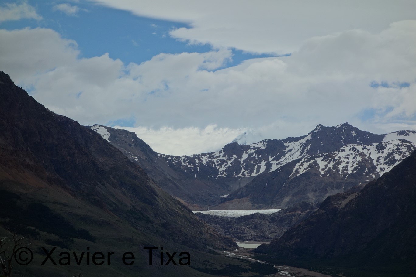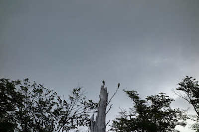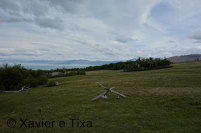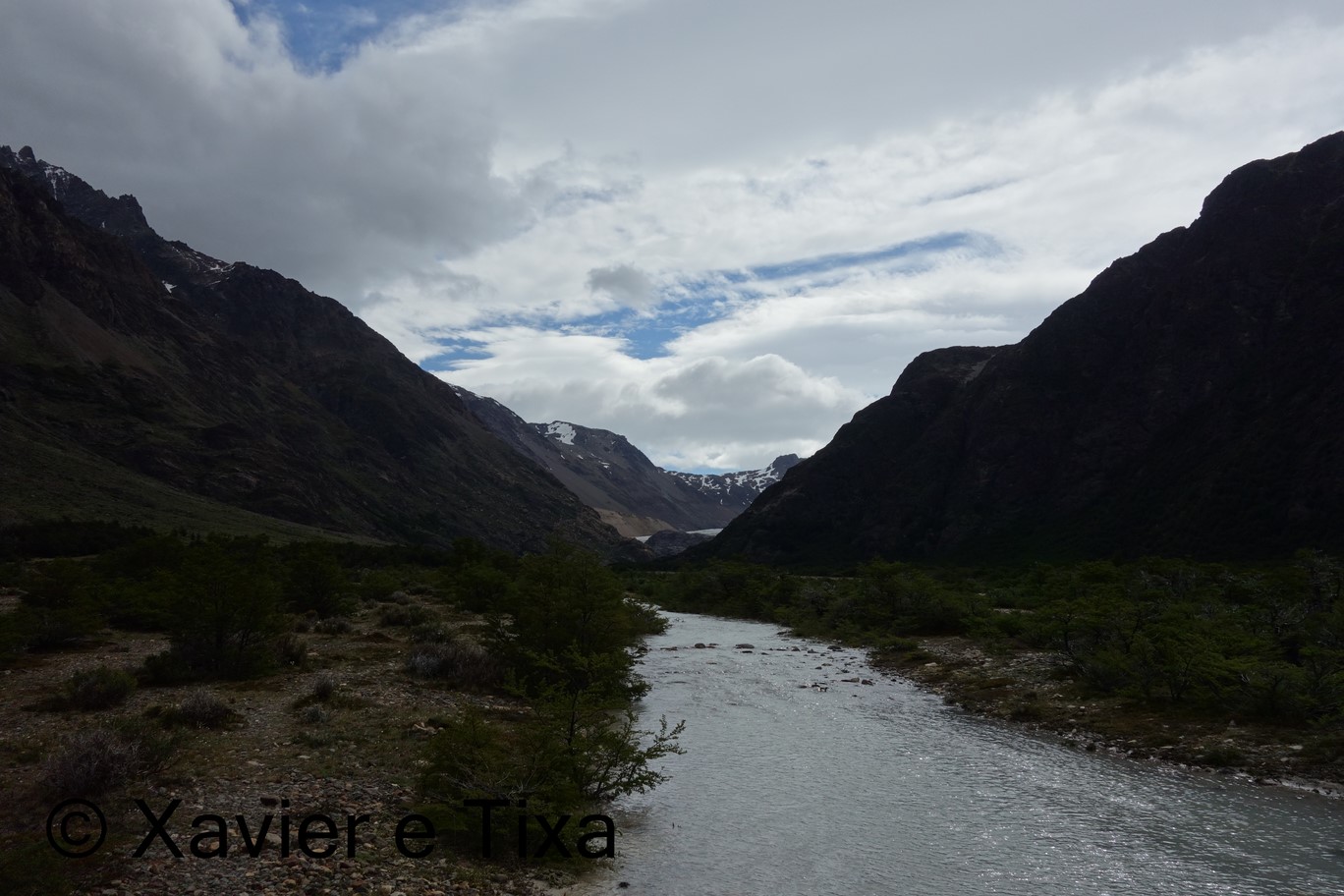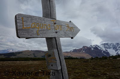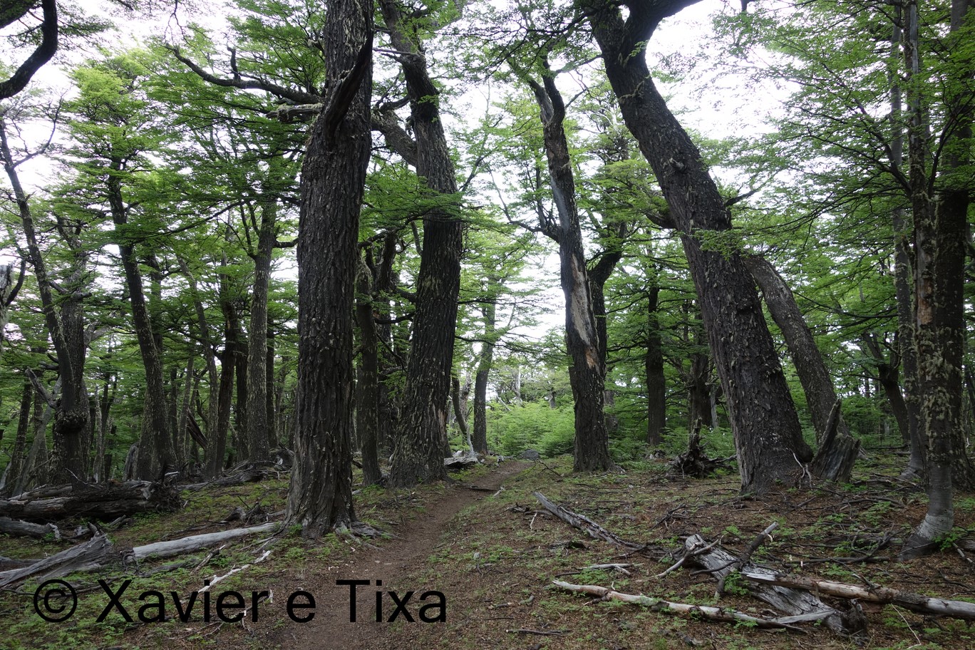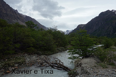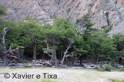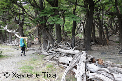 O tempo estava nublado, com 1h40m passamos numa bifurcação onde seguimos para a Laguna Toro, depois segue-se uma boa hora em floresta intercalando com zonas húmidas, entretanto começamos a entrar no vale do Rio Túnel e apanhamos com um vento gélido de frente, a partir daqui seguimos por uma floresta bem mais rasteira, atravessamos dois rios e com 5h15m de caminhada efectiva chegamos ao primeiro acampamento, acampamento Laguna Toro, uma floresta antiga completamente abrigada a Norte e a Oeste, onde uma vez mais existem enormes resguardos redondos feitos com grandes troncos e que protegem enormemente as tendas dos ventos patagonicos.