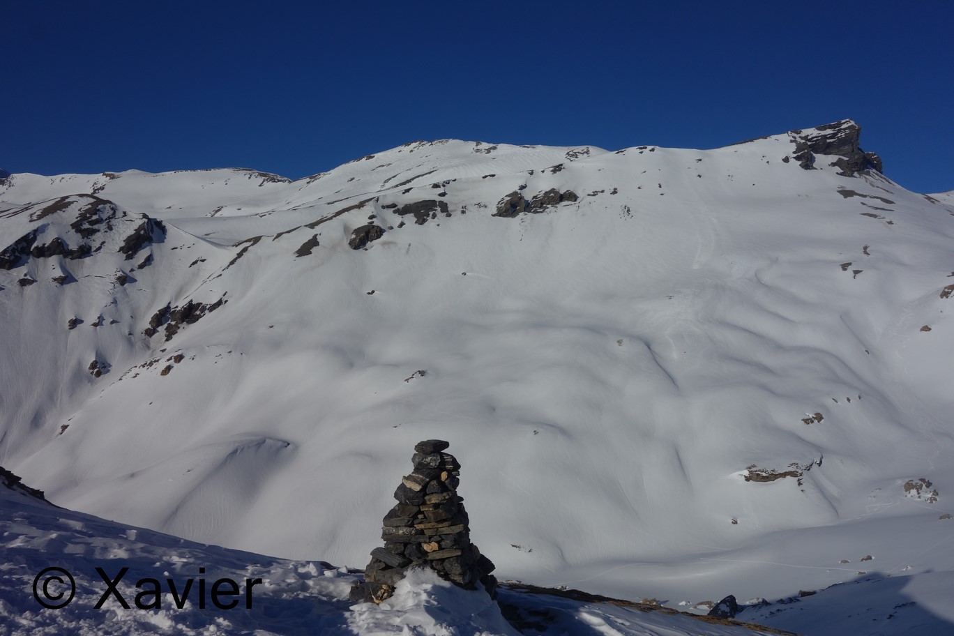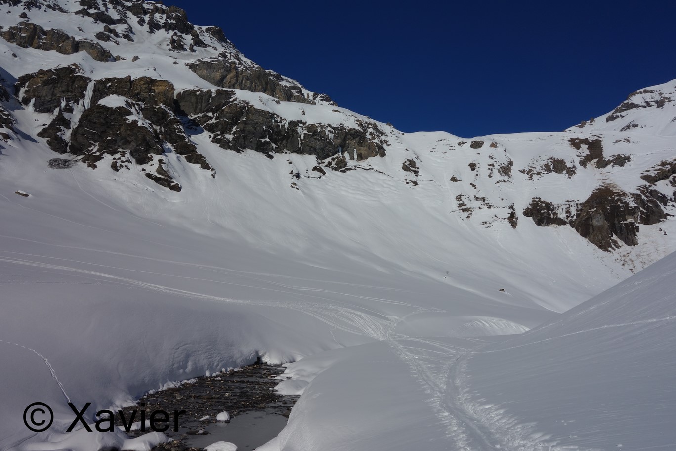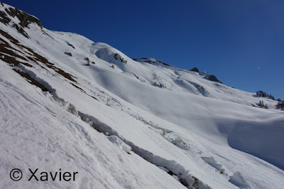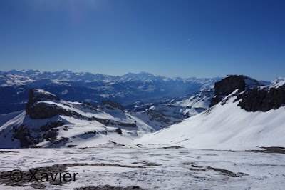 Cheguei a Aminona, perto de Crans-Montana, às 9 da manhã, começo por ir em direcção a La Tièche, passo o Rio continuo rumo ao vale Les Outannes onde já havia várias avalanches, continuo pelo comprido vale, passo ao lado do Col de la Roue e continuo para o Schwarzhorn, onde cheguei com 4h15m desde que deixei o carro, é um percurso extremamente longo, estava um calor anormal para um mês de fevereiro, situação que se arrastava à mais de uma semana.