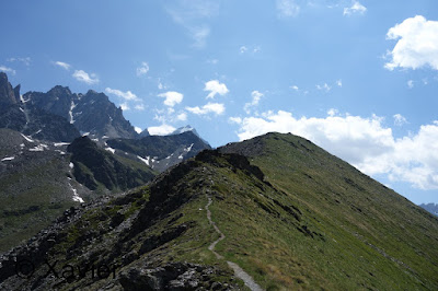 Primeiro o trilho segue por um estradão e em Challand(2070m) passa a trilho de pé posto. Subo pelo trilho a Sul da Torrent de La Croix que corria com uma força brutal. Entro na Combe de Challand e sigo para a aresta Tita de Bou, bela aresta e um belo trilho. Com 1h20m de caminhada passo na Pointe de Penne(2781m), primeiro pico do dia, fiquei por ali alguns minutos a contemplar e analisei bem a aresta Oeste do Le Beaufort(3048m) por onde tinha pensado subir. Vista do pico a aresta tinha bom aspecto, desço a um pequeno colo entre a Pointe de Penne e o Le Beaufort e abandono o trilho marcado para atacar a aresta, em algumas secções as mãos dão uma ajuda mas nunca chega a ser uma aresta técnica.