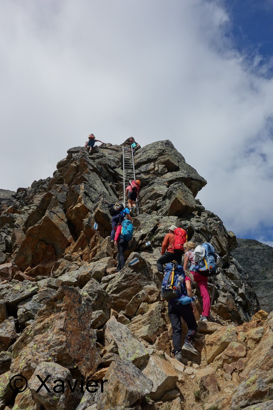 We’re 12, started the hike softly, we had the whole day to reach the Mischabelhutte(3336m), the path climbs gently until it approaches the ridge of the Schwarzhorn, once we reach the ridge at about 2800m the signs blue and white, indicating alpine path, make all the sense, there are a lot of equiped sections with cables, a ladder, the trail goes all along the ridge, but it is never hard.