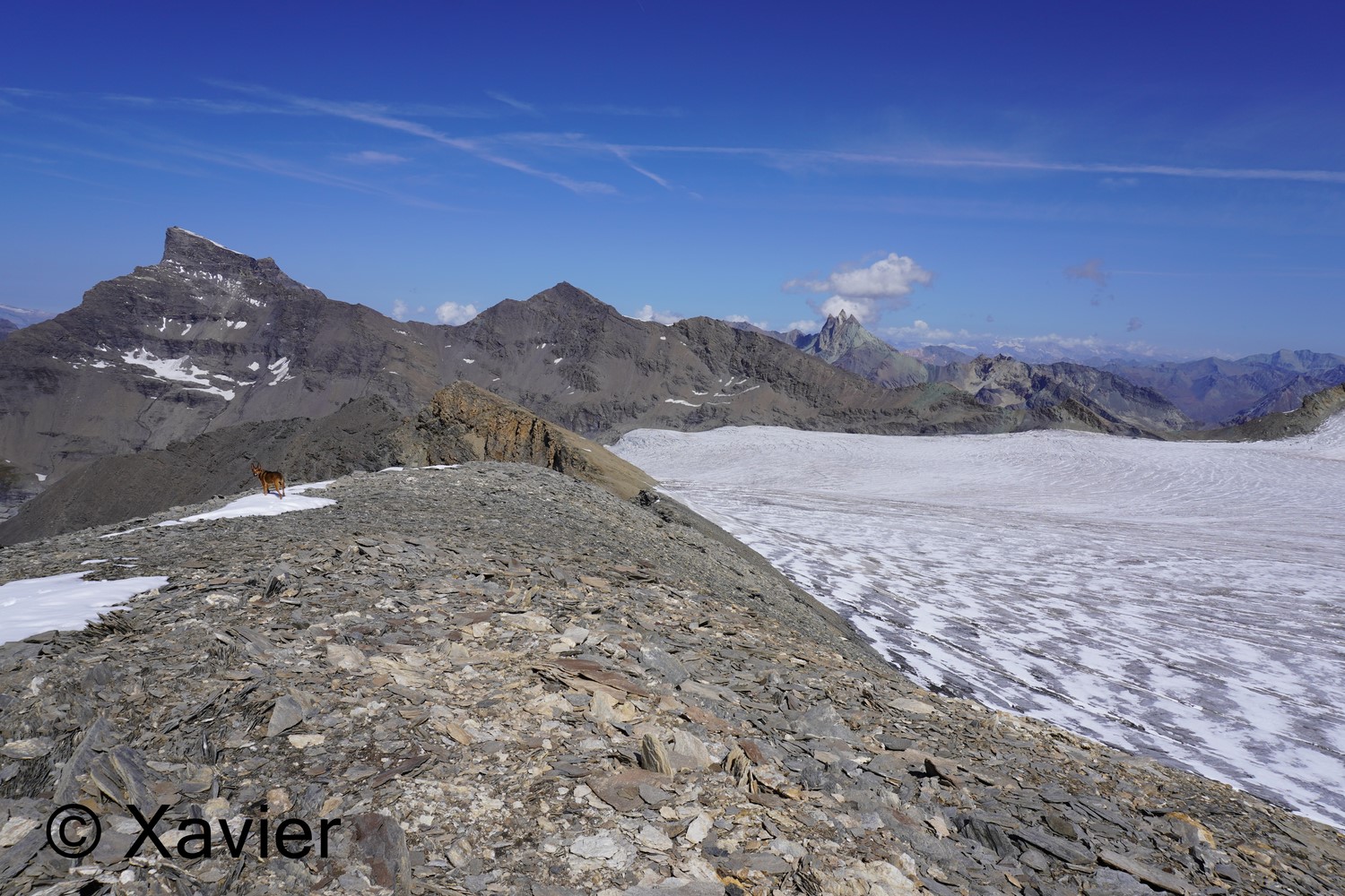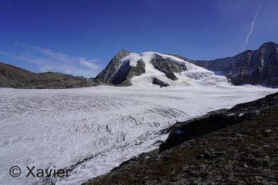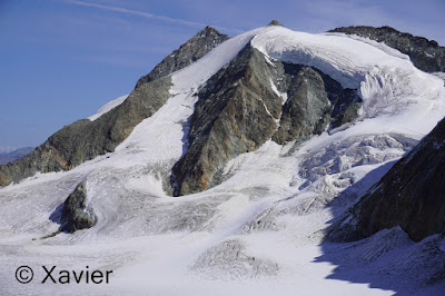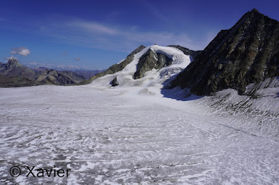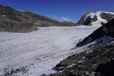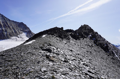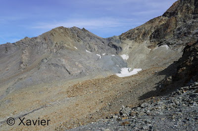 Once at this col i stayed with Col du Mont Rouge ahead, i go down for a couple minutes and then i make the traverse by passing a section of loose rock, until i find again some cairns after passing a snowfield, the progression is never difficult, once at the col du Mont Rouge i stay next to glacier du Giétro, i continued by the ridge of the Mount Rouge du Giétro, at the highest point, 3439m, the view is awesome to glacier du Giétro, La Ruinette and Mont Blanc de Cheilon.