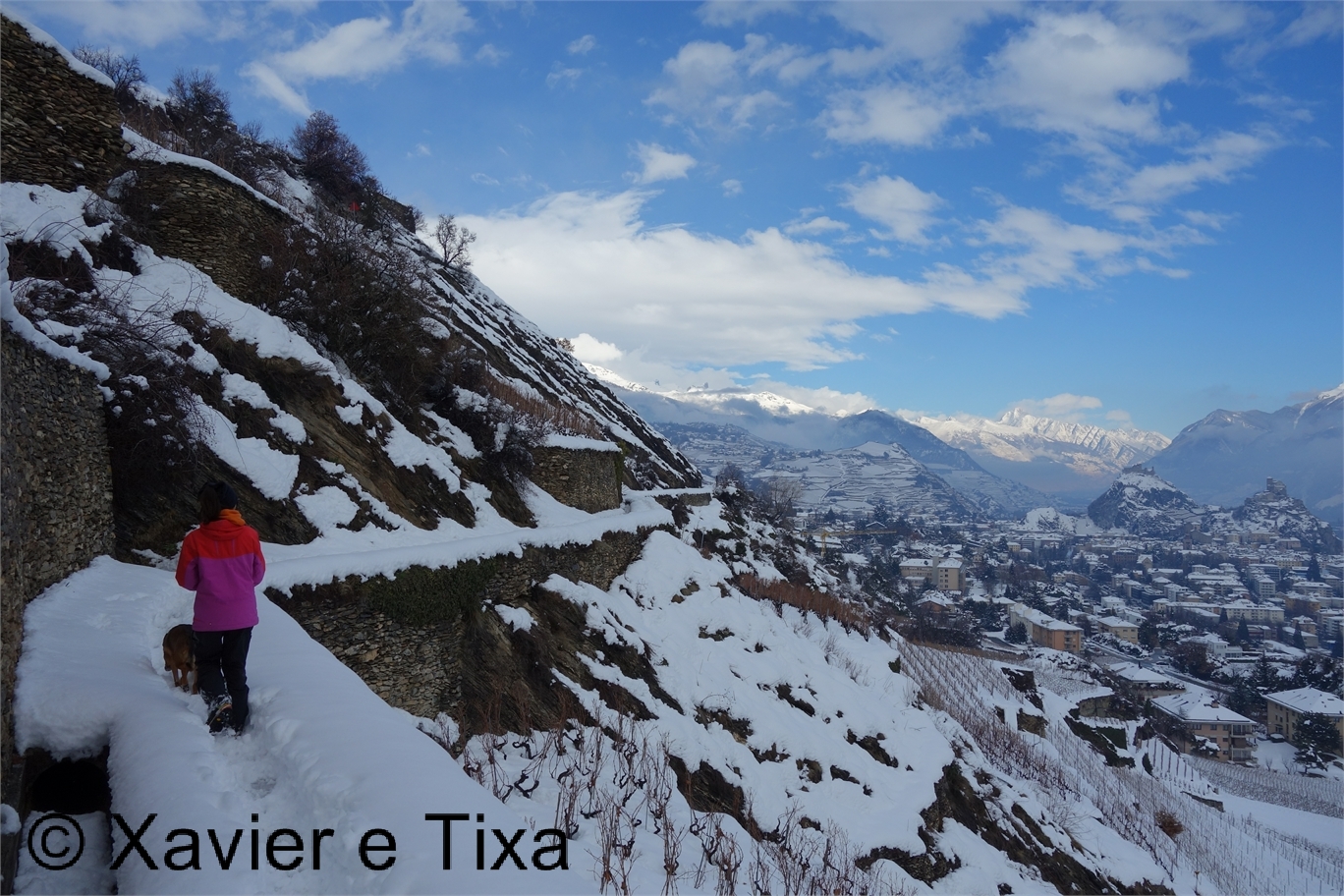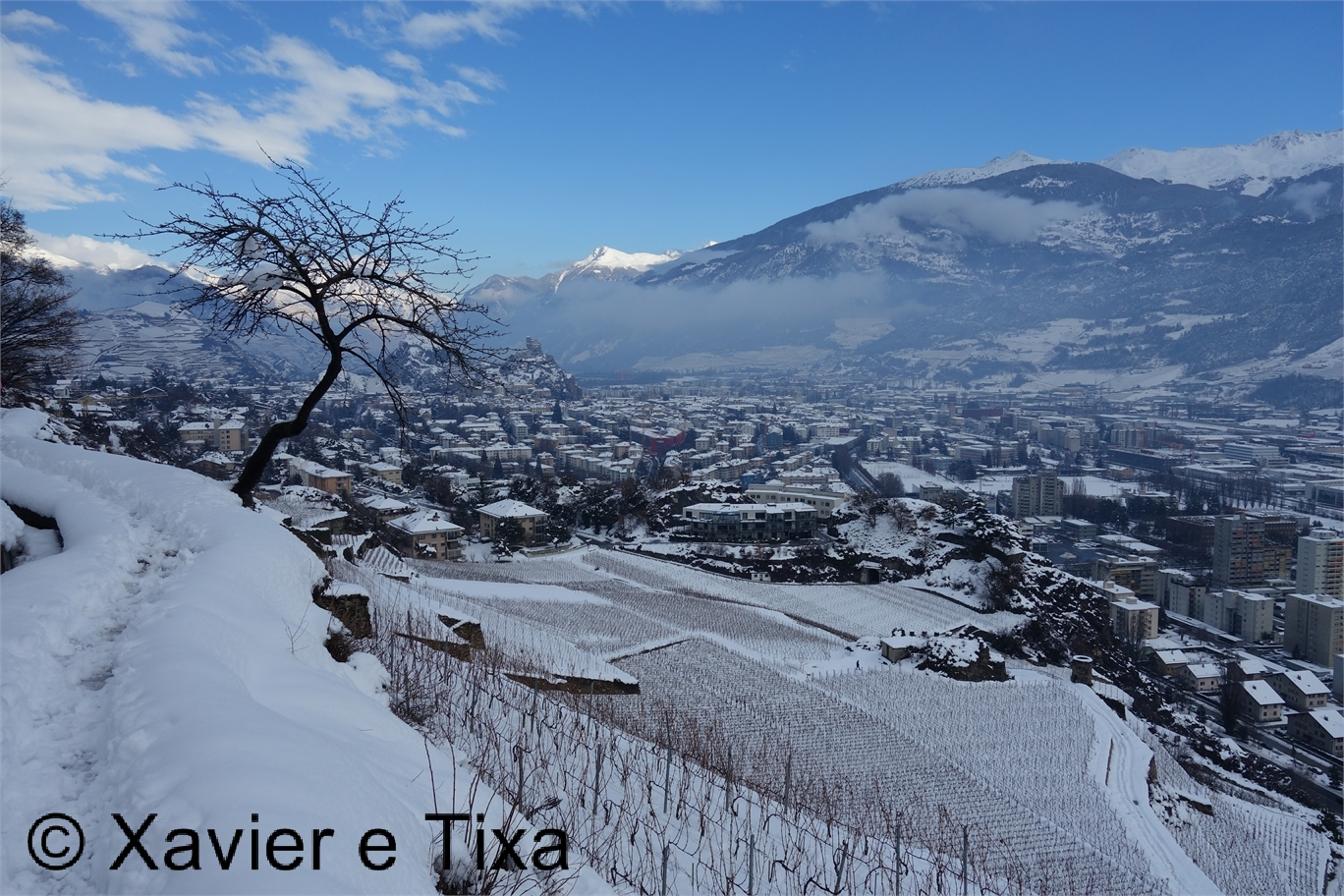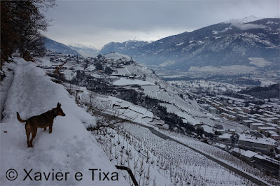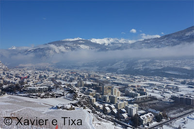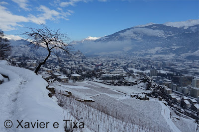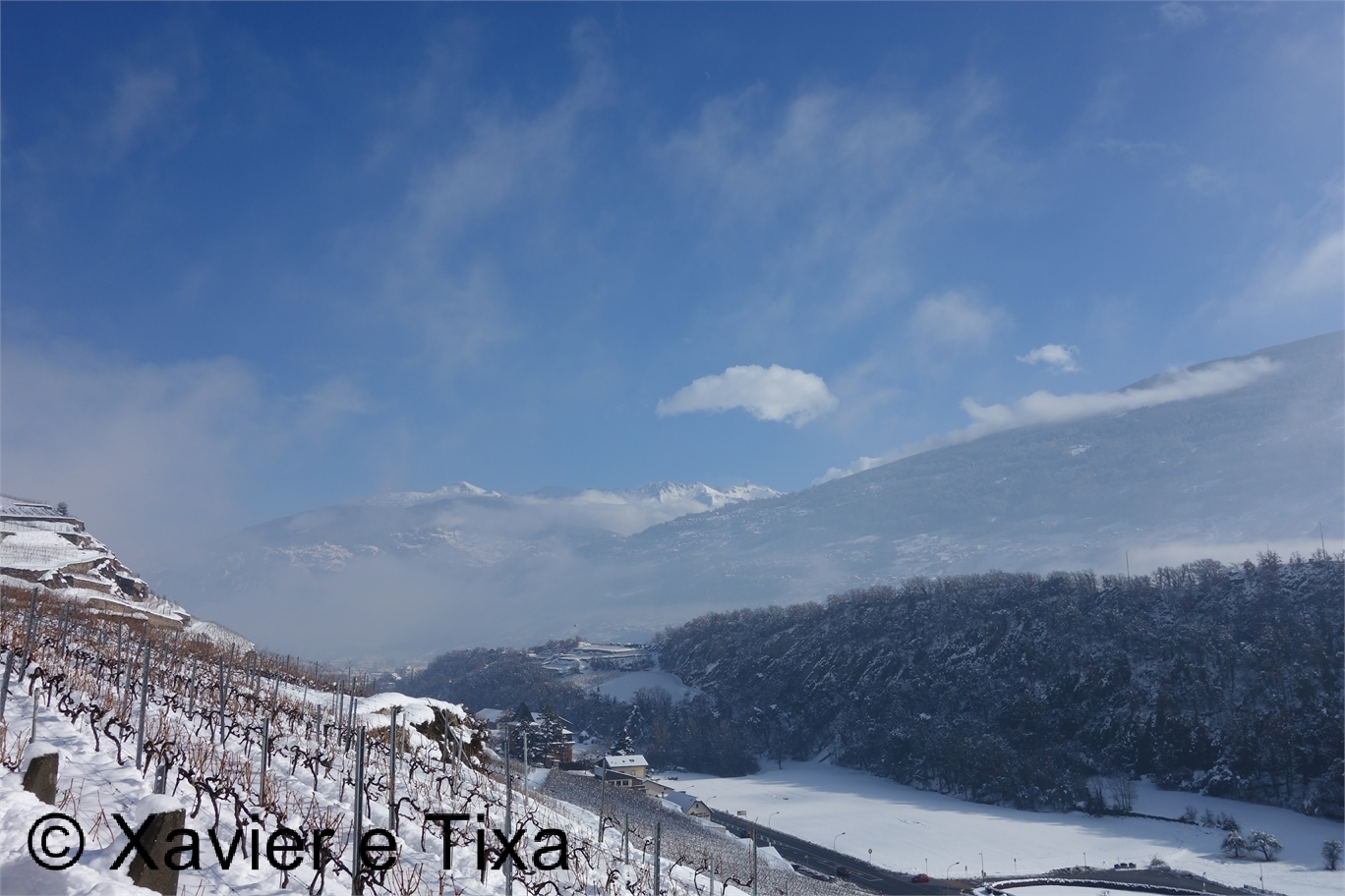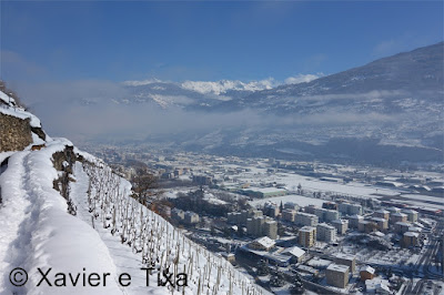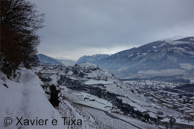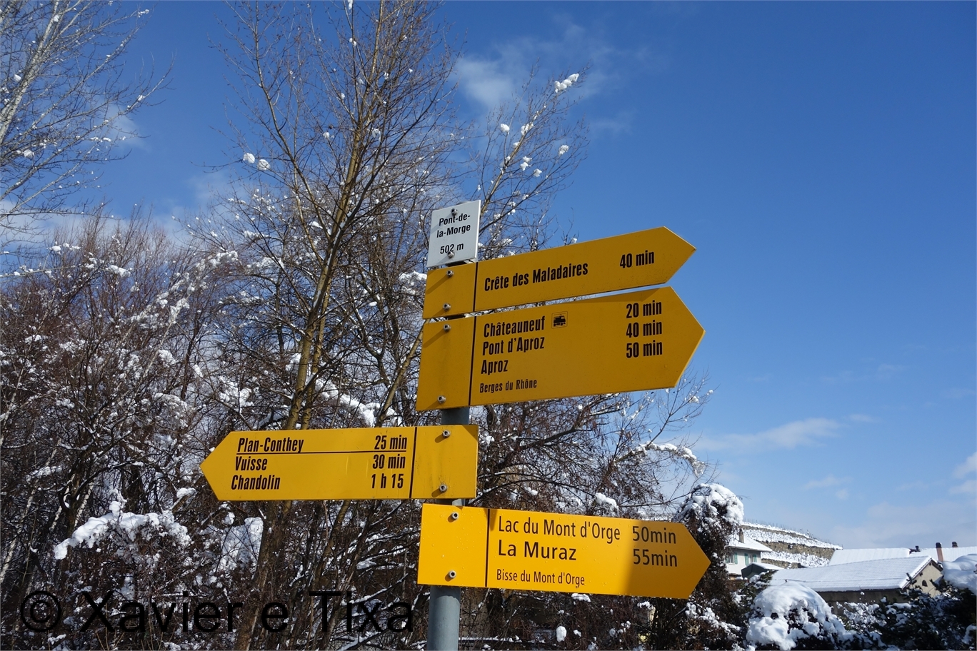 Começamos a caminhar em Pont de la Morge(502m) situado na base do vale do Rhône, logo ali tínhamos acumulações de neve de 20cm, neve fresca e então com o céu azul o cenário estava especialmente bonito o que nos fez demorar um tempão a percorrer os primeiros kms da bisse du Mont d'Orge, à medida que íamos ganhando altitude suavemente e contornando a encosta Sul do Mont d'Orge as vistas iam-se alargando, com Sion a escassos kms.