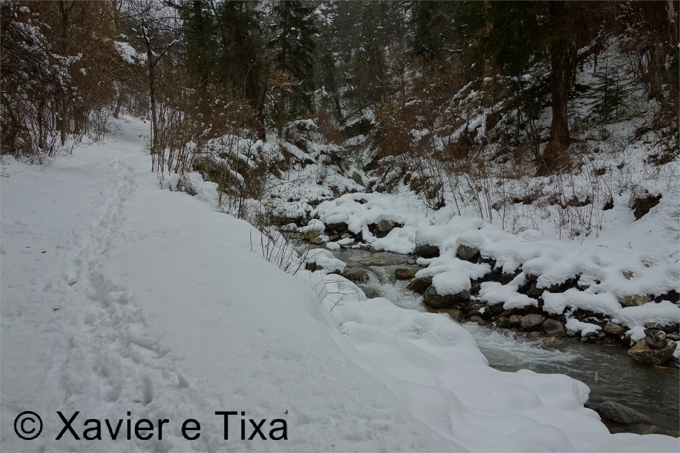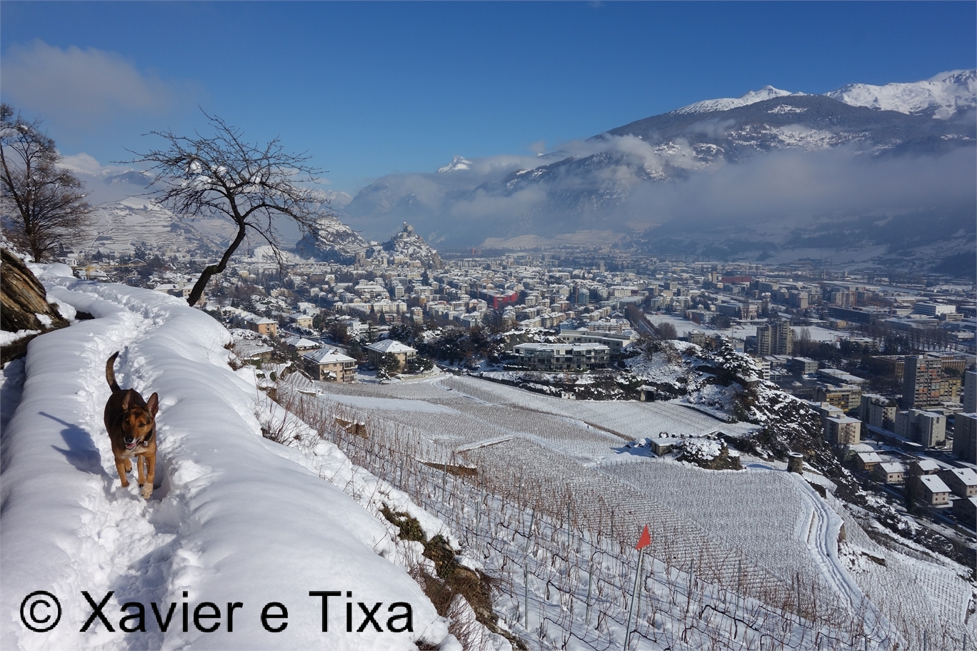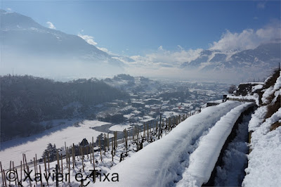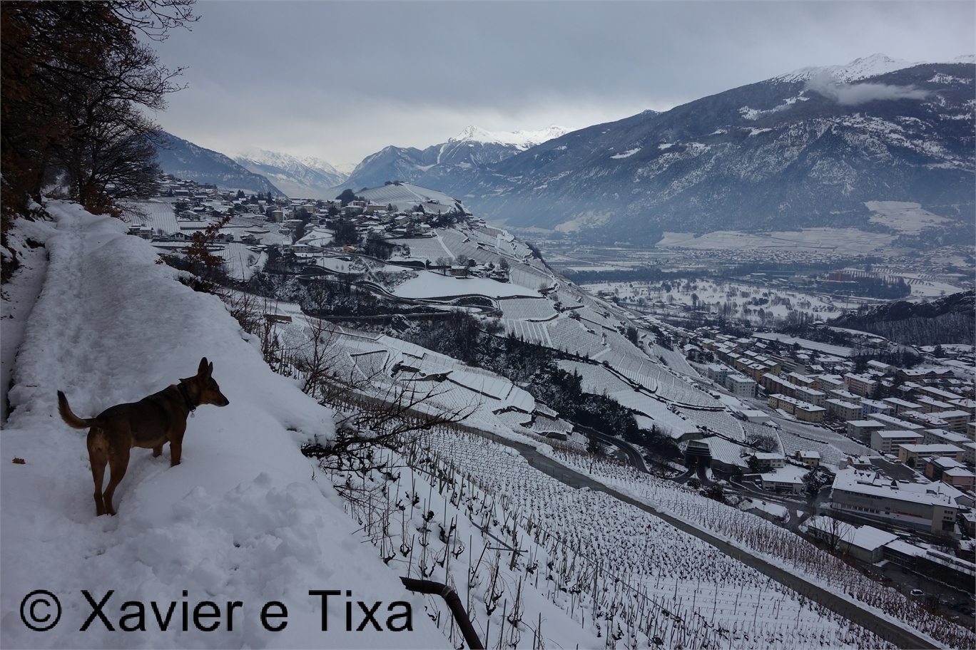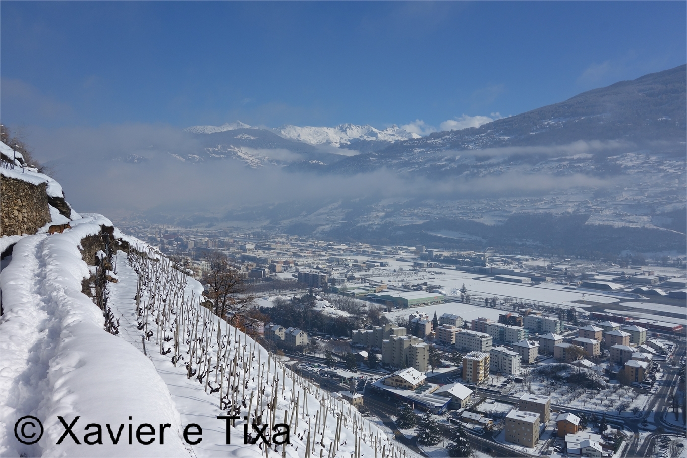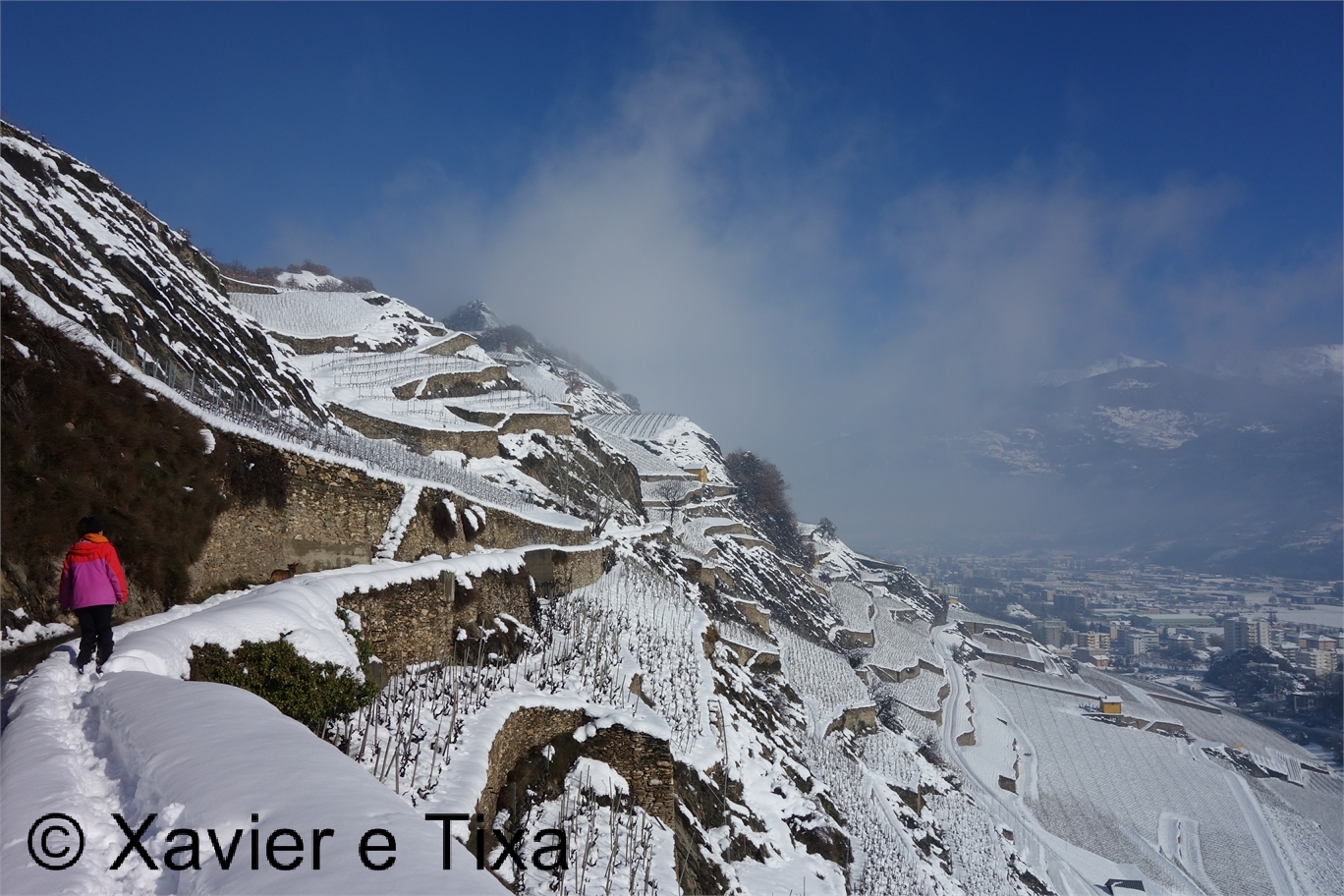Começamos a caminhar em Pont de la Morge(502m) situado na base do vale do Rhône, logo ali tínhamos acumulações de neve de 20cm, neve fresca e então com o céu azul o cenário estava especialmente bonito o que nos fez demorar um tempão a percorrer os primeiros kms da bisse du Mont d'Orge, à medida que íamos ganhando altitude suavemente e contornando a encosta Sul do Mont d'Orge as vistas iam-se alargando, com Sion a escassos kms.