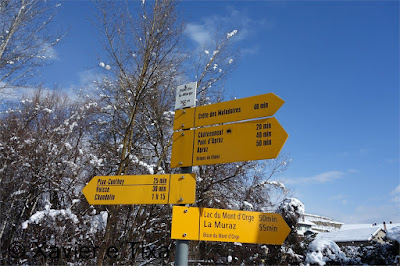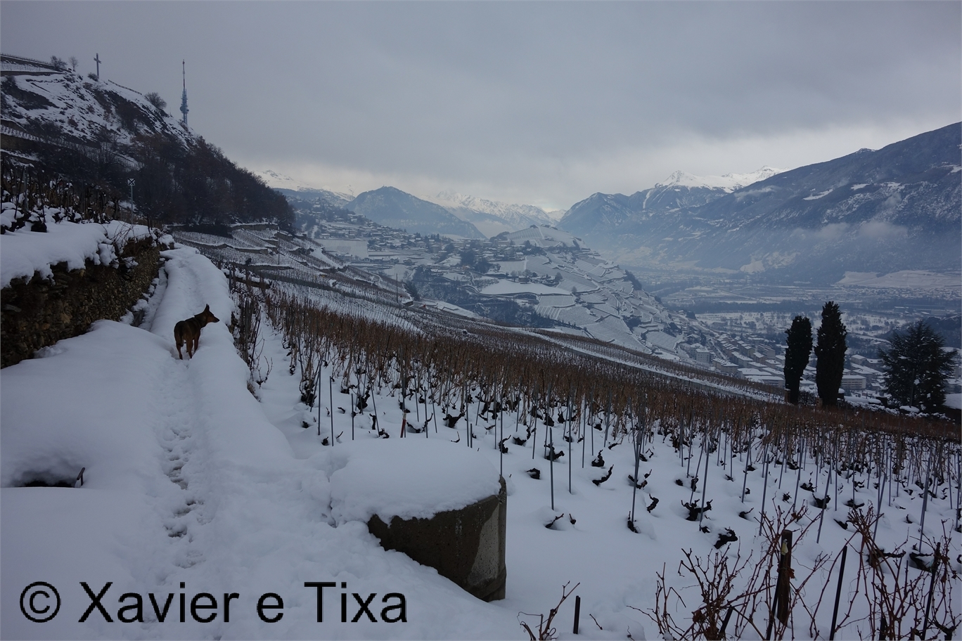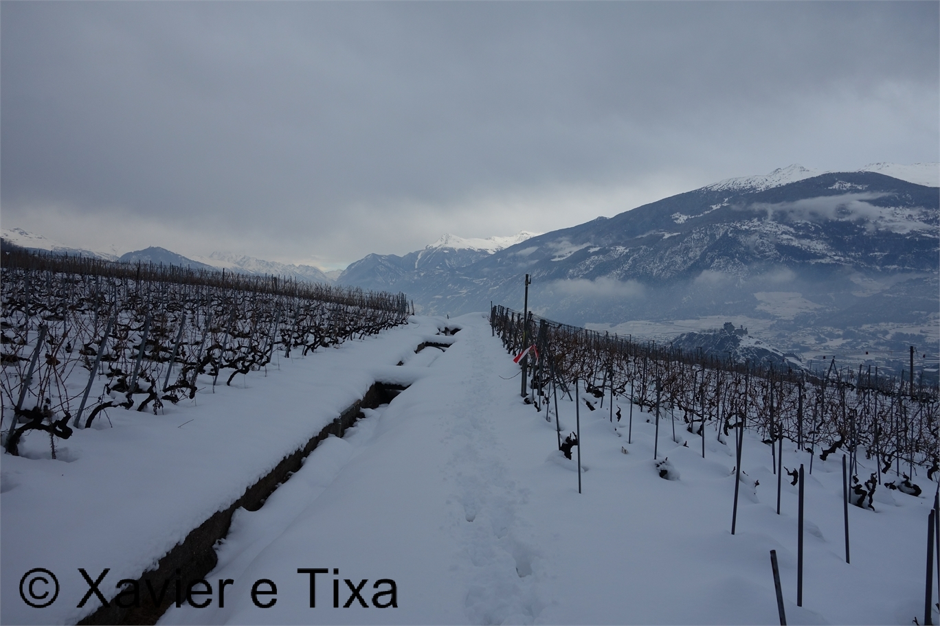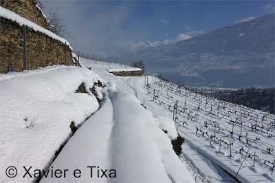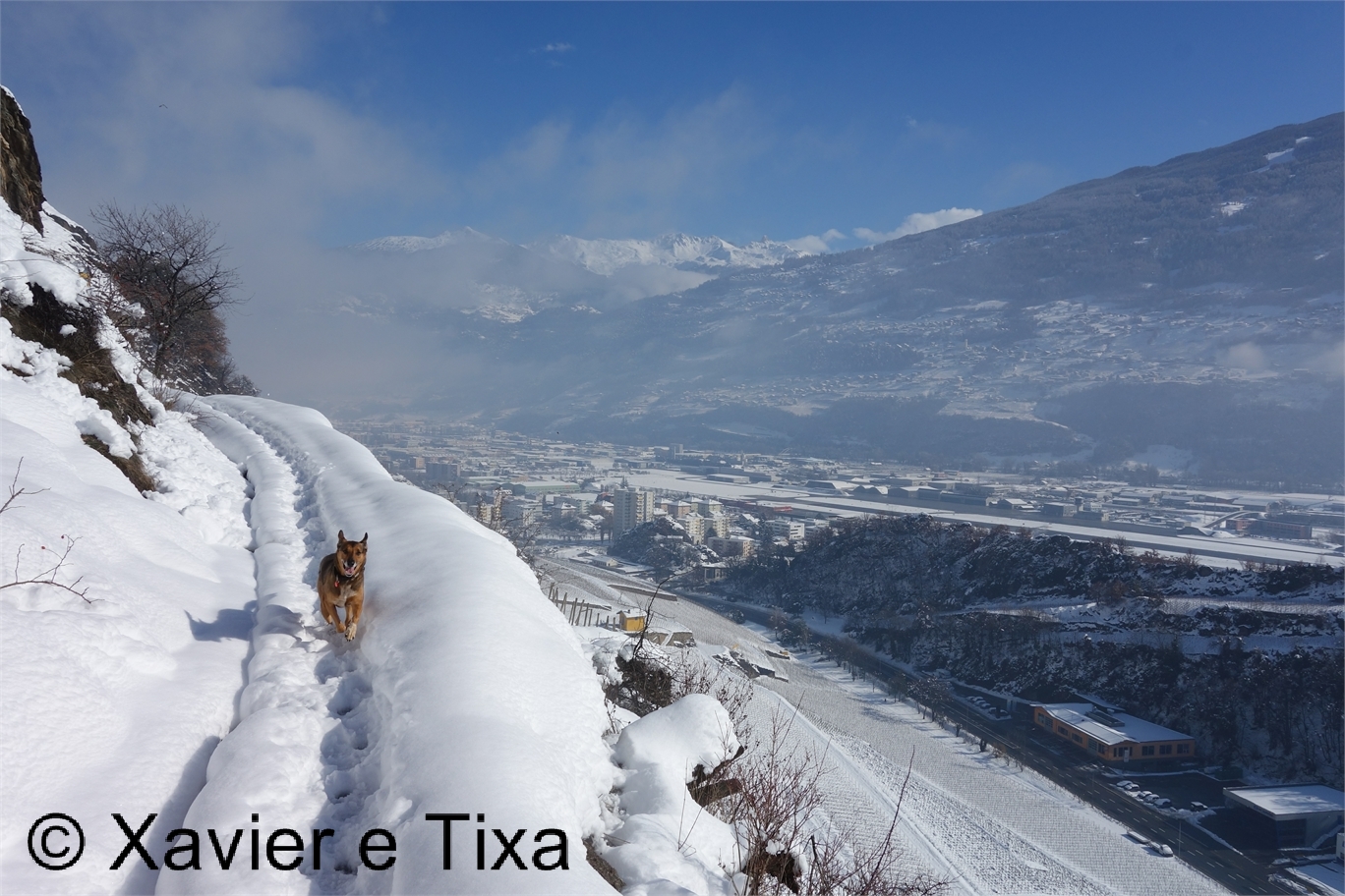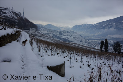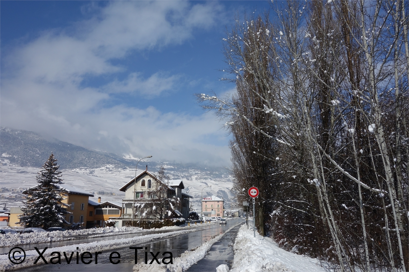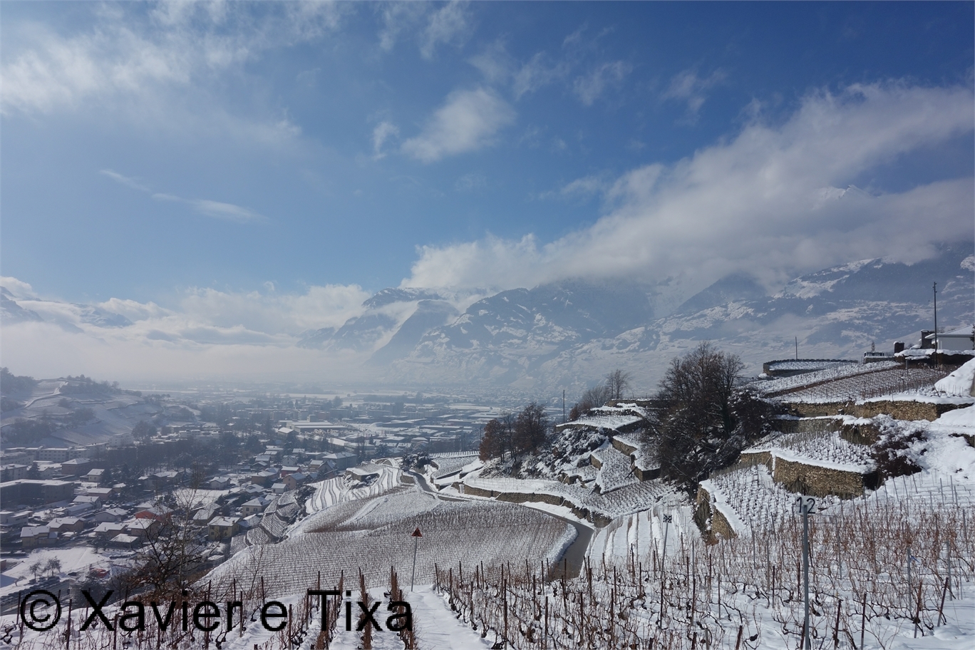 Começamos a caminhar em Pont de la Morge(502m) situado na base do vale do Rhône, logo ali tínhamos acumulações de neve de 20cm, neve fresca e então com o céu azul o cenário estava especialmente bonito o que nos fez demorar um tempão a percorrer os primeiros kms da bisse du Mont d'Orge, à medida que íamos ganhando altitude suavemente e contornando a encosta Sul do Mont d'Orge as vistas iam-se alargando, com Sion a escassos kms.