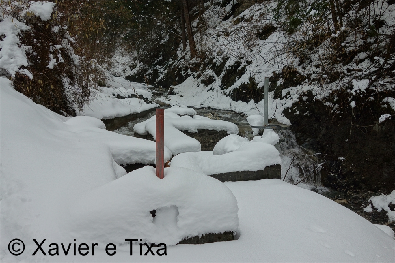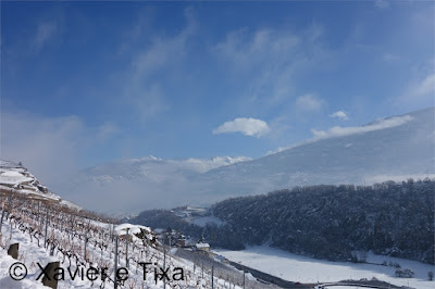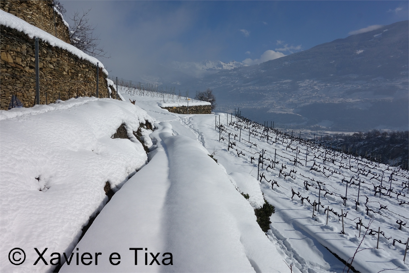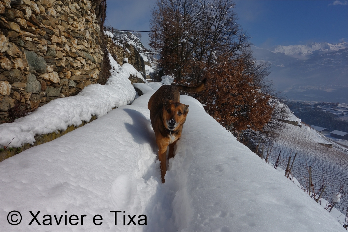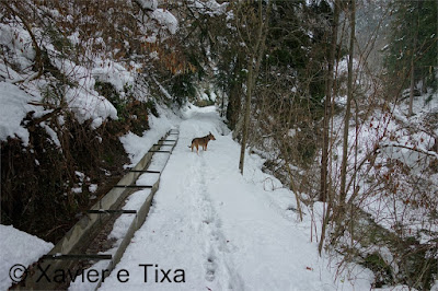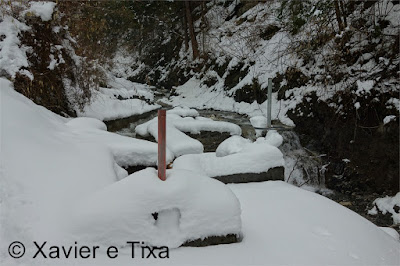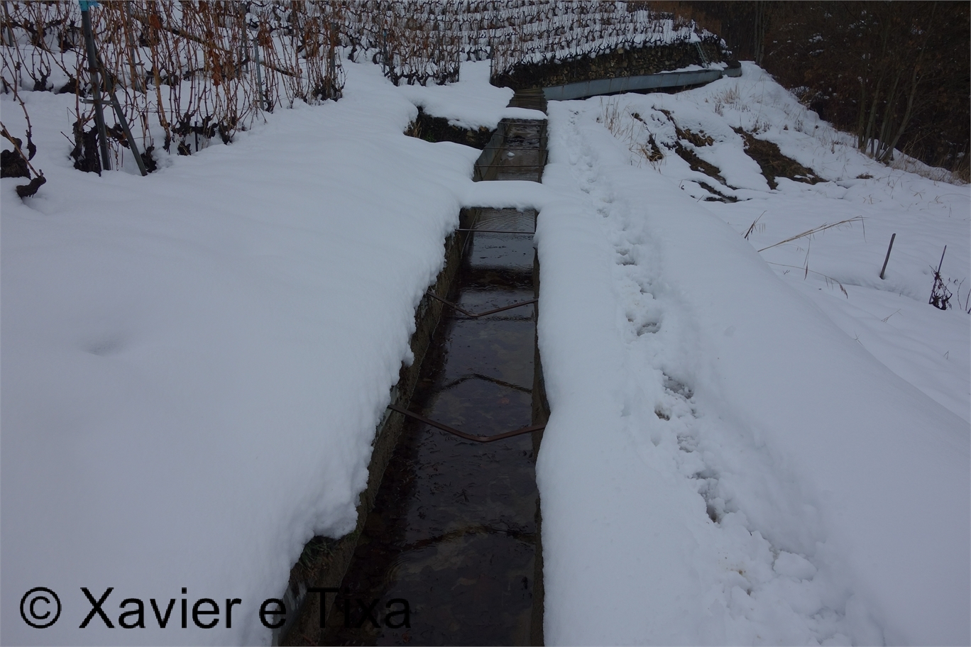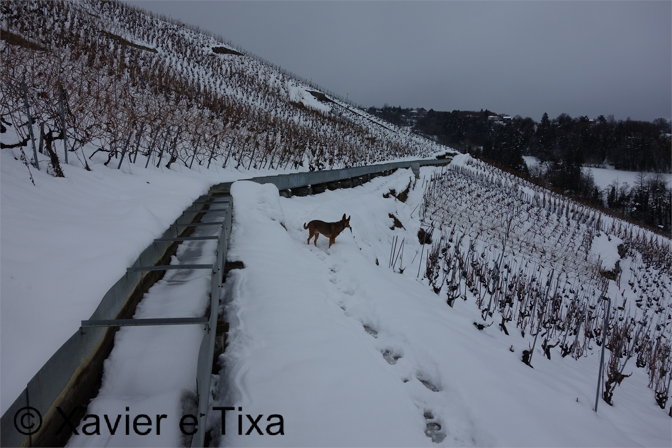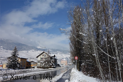 Começamos a caminhar em Pont de la Morge(502m) situado na base do vale do Rhône, logo ali tínhamos acumulações de neve de 20cm, neve fresca e então com o céu azul o cenário estava especialmente bonito o que nos fez demorar um tempão a percorrer os primeiros kms da bisse du Mont d'Orge, à medida que íamos ganhando altitude suavemente e contornando a encosta Sul do Mont d'Orge as vistas iam-se alargando, com Sion a escassos kms.