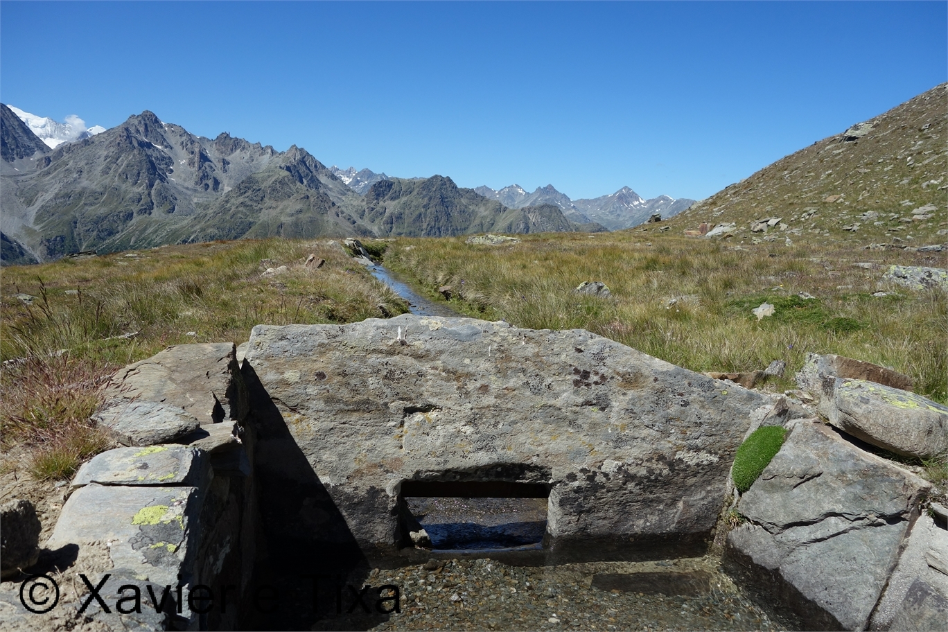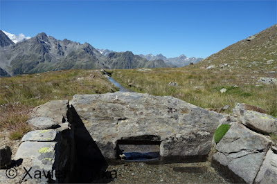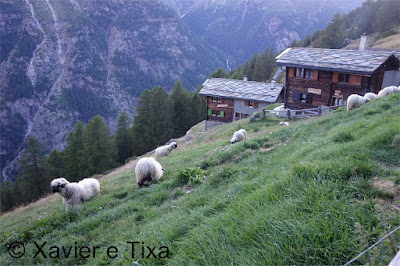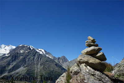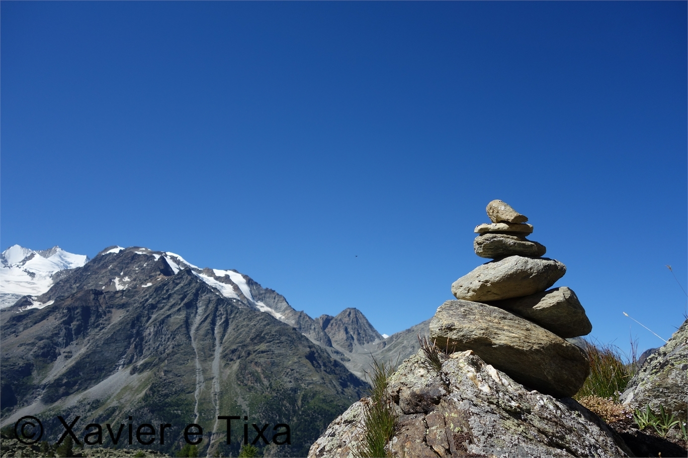 5 minutos depois passava no simpático Fletschhornhutte, situado ao lado do que sobra do Gamsagletscher, chegava a hora de regressar, restou seguir as grandes mariolas e um caminho evidente não marcado, lindo, sempre do lado direito da linha de água principal deste belo vale. Uma hora depois passava novamente na zona da escombreira, Janzibode, desta feita continuámos sempre pela levada até ao fim e fomos parar ao pé de um barraco bem visível quando se chega ao plateau de Siwibode, este barraco é a referência a seguir para passar facilmente esta parte do caos granítico. O resto do percurso foi pelo mesmo caminho, nunca pensámos fazer uma caminhada tão selvagem na região de Saas-Fee, foi um percurso maravilhoso.