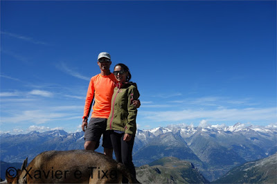 Estava-se tão bem, ficámos uma meia hora no paleio e entretanto eles iniciaram o regresso, uma vez mais, o segredo da boa forma física destes senhores é não parar, a caminhada que estavam a fazer é exigente, um T4. Nós ainda ficámos por ali um bom bocado, a temperatura estava agradável e o céu limpo, as vistas são top! Bietschhorn, Aletschhorn, glaciar do Aletsch, Monte Leone, Fletschhorn, Lagginhorn, Weissmies, montanhas de Mischabel, Weisshorn, Bishorn...