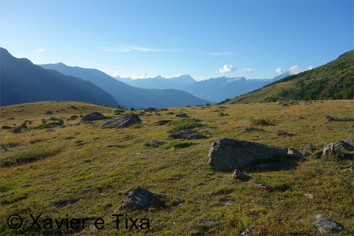 Tomamos o pequeno almoço, preparamos as malas e arrancámos rumo a Siwibode, subimos escassos minutos pelo interior da floresta até desembocar no estrondoso plateau de Siwibode(2200m), deste ponto, onde passa o trilho dos colos alpinos, apontamos para leste e abandonamos o trilho marcado, passamos por uma enorme escombreira constituída por grandes blocos, esta parte do percurso não é evidente, poucos depois víamos o que parecia ser uma levada mas não queríamos acreditar que no meio daquele caos granítico havia uma levada, mas ela está lá. O cenário estava genial, continuamos pela levada que acaba por ser a melhor forma de atravessar esta zona, terminada a levada passamos numa linha de água numa tábua e apontamos pleno norte rumo ao Simelihorn(3123m), a subida pela encosta Sul é suave, acessível e não tem trilho marcado, aliás a única parte de trilho marcado deste dia foi só os primeiros minutos entre Siwine e Siwibode, o resto do percurso foi em "trilho" não marcado.