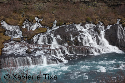 De Borgarnes seguimos para Hussafel, visitámos a primeira atracção uma hora depois, umas belas cascatas num antigo rio de lava, Hraunfossar Barnafoss, muito bonito, continuamos para uma gruta não longe dali, funciona com visitas guiadas e teríamos de esperar uma hora e tal até à próxima saída, abandonámos, em seguida visitei de novo as cascatas Glanni e lá perto fiz o percurso do vulcão Grabrokargigar, cheio de passadiços de madeira, muito giro.