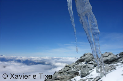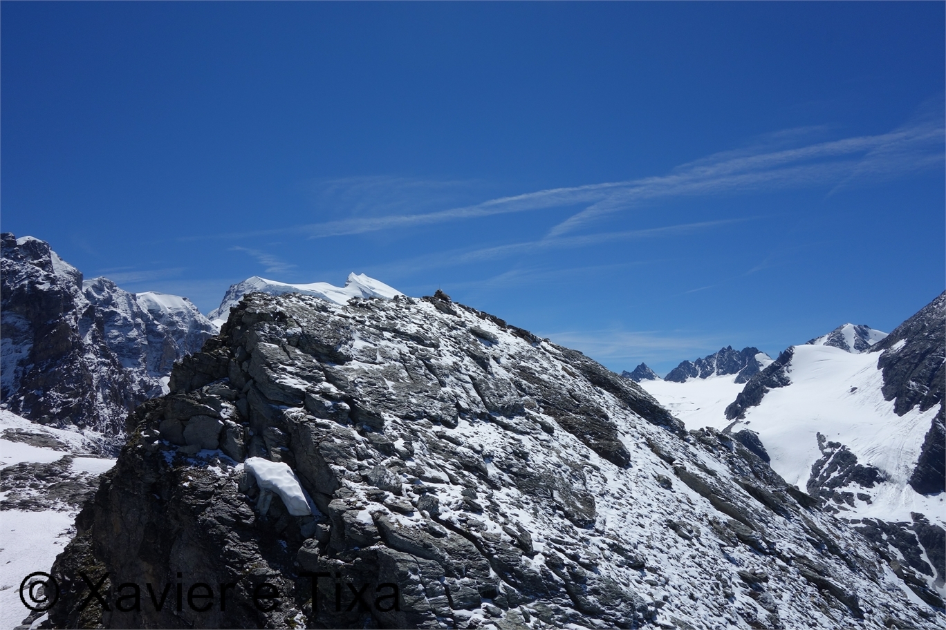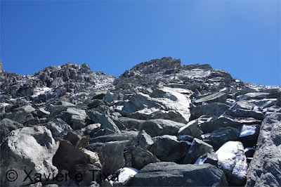 Depois de alguma hesitação lá fomos subindo, eu e a Xarah, a Tixa decidiu ficar por ali, ainda lhe liguei para dizer que era muito melhor passar pelo lado direito do rochedo, já na companhia do tal casal subiram um pouco mas acabaram por abandonar. Uns 20 minutos depois chegava à cumeada ficando a escassos minutos do Grand Tavé(3157m), a face norte estava completamente gelada pelo que voltei a hesitar, mas passo após passo lá fui avançando e consegui chegar ao pico, nesta fase a Xarah já tinha descido ao encontro da Tixa.