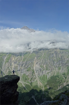 Neste Sábado iniciamos a caminhada no parque de estacionamento da barragem de Mauvoisin(1840m), subimos para O à medida que o trilho ziguezagueia encosta acima e rapidamente ganhamos 300m de desnível, o céu estava azul mas via-se uma camada de nevoeiro para onde nos dirigíamos, em Pazagnou(2147m), primeira bifurcação, continuamos na direcção do Col des Otanes, passamos na ribeira de Pazagnou onde é facilmente visível o resultado de um enorme deslizamento de terra e rocha, muita rocha, na corga existem dezenas de blocos do tamanho de casas, é uma parte interessante do trilho. Uns 20 minutos depois passamos em La Tseumette(2297m), continuamos para NO e por volta dos 2500m, numa zona com vários pequenos lagos, o trilho flecte para SO, numa altura em que nos embrenhamos na espessa camada de nevoeiro. Cruzámo-mos com várias pessoas que desciam do Col des Otanes, a julgar pela disposição da malta, estava bom tempo lá em cima, o que se viria a confirmar uns 20 minutos depois.