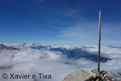 O cenário estava inesquecível, já tinha saudades de estar acima das nuvens, por momentos esqueci-me que tinha ainda uma tarefa difícil pela frente, a descida. A vista 360 passa pelos Combins, o plateau do trient ao longe, os dents du midi, Muveran, Mont Fort, Le Parrain, Pointe des Chamois, Pointe du Vasevay, o incrível le Pleurer, Mont Blanc de Cheilon, Ruinette, todos acima do espesso manto de nevoeiro, momentos que ficarão guardados para sempre na minha memória.