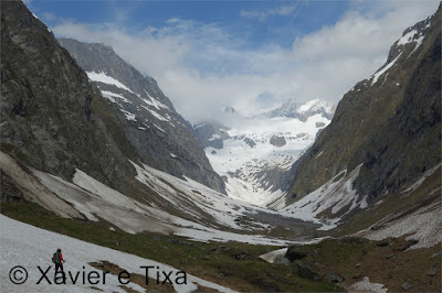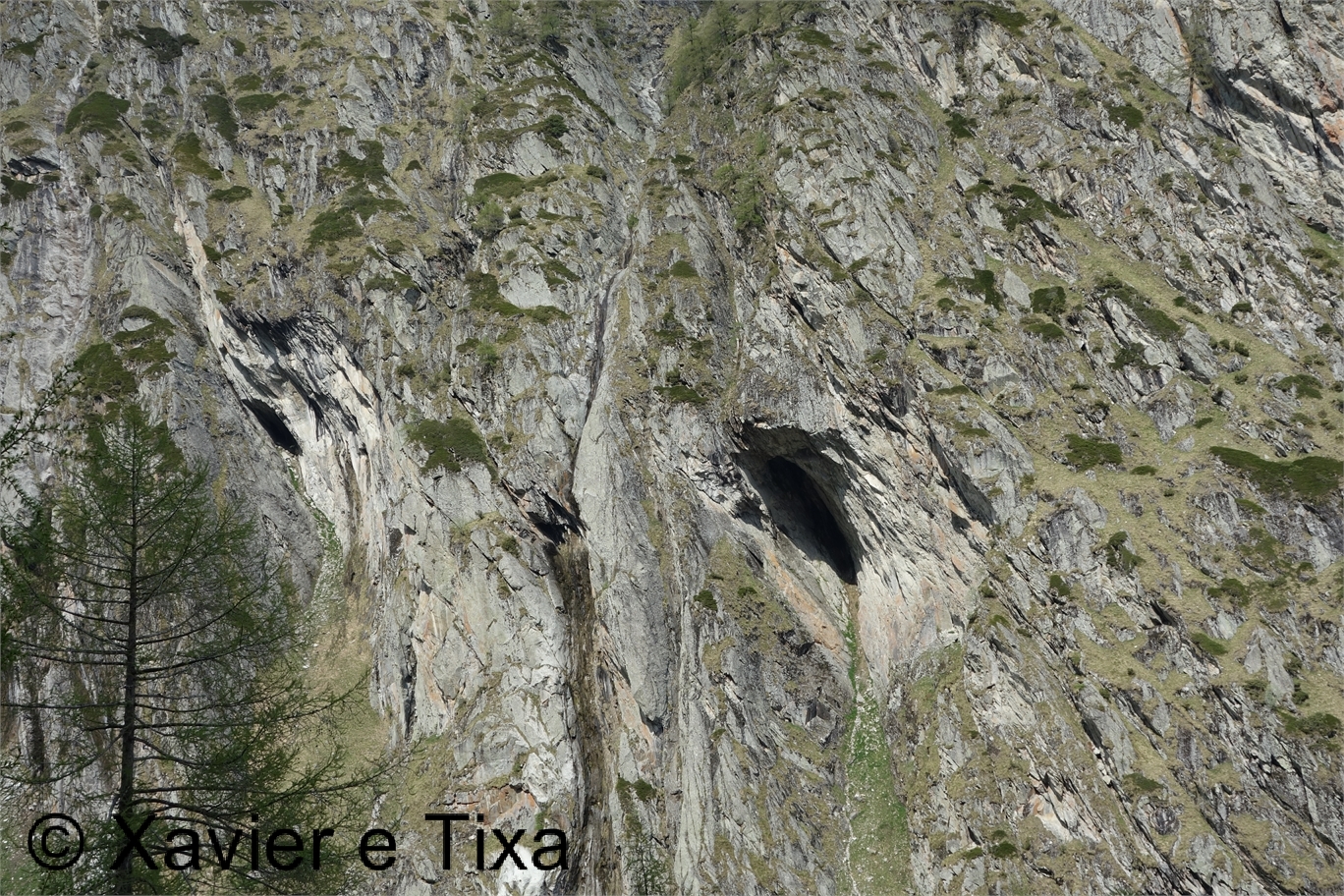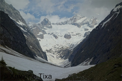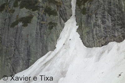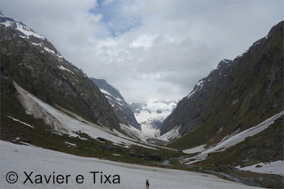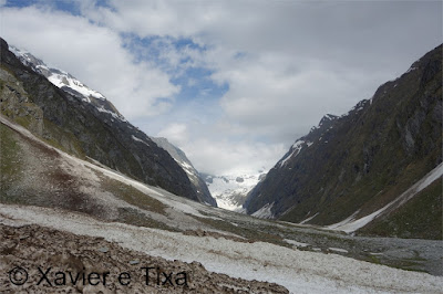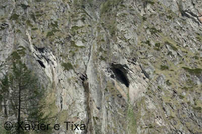 Partindo de Mund(1200m) rapidamente entramos no vale rumo a N, minutos depois passamos em Mundchi(1181m), a partir daqui prosseguimos sempre próximos do rio e sempre com o rio do nosso lado direito, passamos em Stafelbode(1592m), Strick(1655m) e Luterbrunno(1820m), passando por dezenas de enormes avalanches que trouxeram neve dos topos até à base do vale, inclusive ainda assistimos a duas que consegui gravar, cerca dos 1900m chegávamos ao fim do vale coroado pelo Nesthorn(3821m), por aqui era fácil identificar marmotas, bouquetins, chamois e fezes de lobo.
