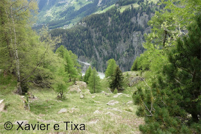 Nesta zona da ponte estávamos comprometidos com o trilho, voltar atrás significava sempre umas 4h30m de caminhada, almoçamos assim que passamos a ponte e recomeçamos a subir na direcção de Riederfurka, passamos num pequeno lago onde há 80 anos era zona de glaciar e onde agora existe um pântano em formação, embrenhamo-nos na bela floresta Aletschwald, zona protegida e património mundial da Unesco da região do Jungfrau-Aletsch, sem passarmos por ninguém(adoramos quando é assim) avançávamos a bom ritmo, após uma hora nesta bela floresta chegámos a uma bifurcação em Teiffe Wald e continuamos para a barragem Stausee Gibidum, meia hora depois numa nova bifurcação em Nessul(1957m) continuamos novamente em direcção à barragem, depois de ganhar quase 500 metros em altitude era hora de voltar a perder outros 500 metros, descida essa que nos demorou 50 minutos até à barragem ziguezagueando montanha abaixo, passamos no paredão da barragem Gibidum(1436m) e em duas partes com várias estruturas metálicas que permitem o acesso a esse mesmo paredão e continuamos para Blatten(1456m), assim que podemos recomeçamos a subir rumo a Taatsche(1800m), subida essa que fizemos tranquilamente em uma hora terminando assim este espectacular dia, na altura ainda não tinha gps, foi pena porque iria dar uns valores interessantes, foi seguramente uns 1500m de desnível positivo e umas boas 8 horas de caminhada efectiva, a distância percorrida não deve ter ficado muito longe dos 25km. Assim terminou mais um fim de semana muito bem passado no Alto Valais, venham mais!