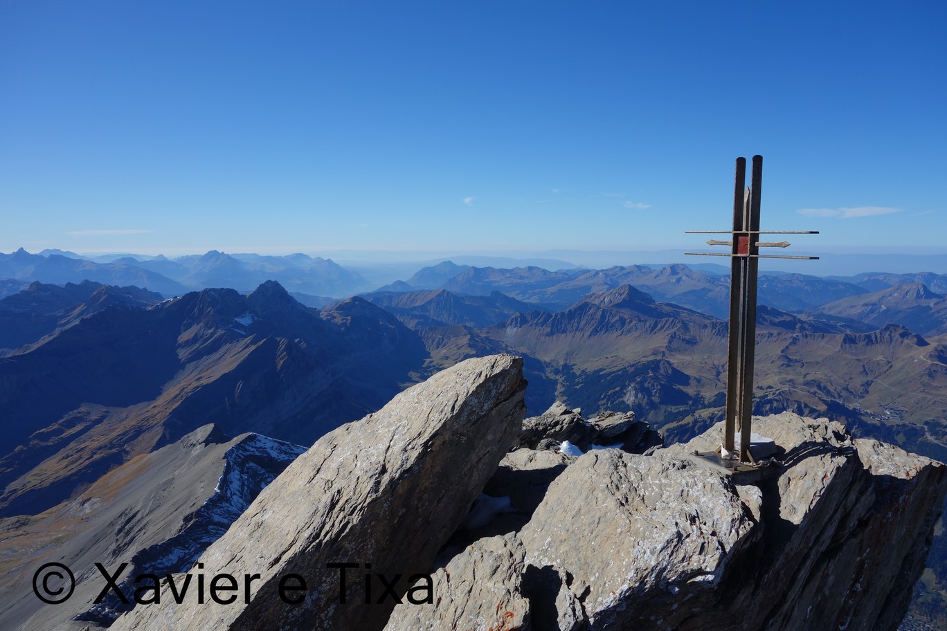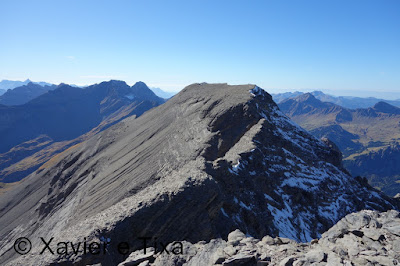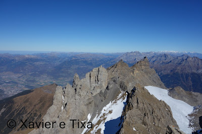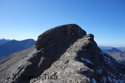 O trilho está bem definido até ao pico, trata-se de um T4- , da primeira vez que tinha subido na Haute Cime, há 4 anos atrás, tinha achado a subida muito impressionante talvez porque não estava ainda à vontade com este tipo de trilhos algo expostos. Uma hora depois de sair do Col de Susanfe passo no Col des Paresseux(3035m), neste ponto a Haute Cime ergue-se à minha frente, os 200m finais de desnível são feitos em 20/25 min num terreno bem mais inclinado.