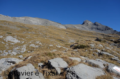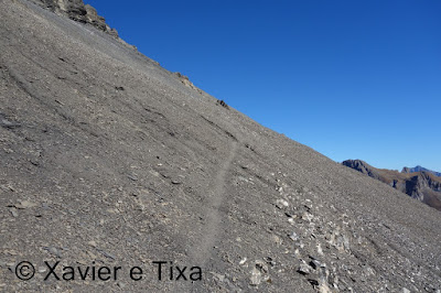 Chegava a hora de retomar a caminhada, desci em 15 min ao Col des Paresseux, neste ponto saio à direita e contorno a barra rochosa da face sul da Haute Cime rumo à Arête des Lacs, esperava-me uma secção de escalada, nível 3, um pequeno ressalto de 4/5m, razão pela qual não levei a Xarah, e ainda bem!