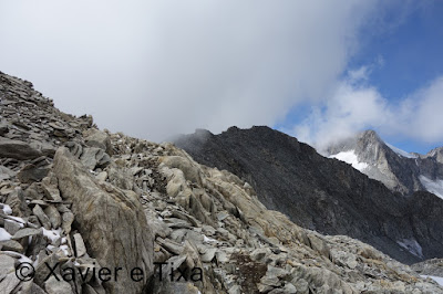 Seguimos então por esse trilho até ao Chastellicke(2658m), neste colo ao olhar para Oeste creio que percebemos o porquê do trilho estar ao abandono, a face norte do Gross Chastelhorn é muito exposta a enormes desabamentos de pedra, é uma parte muito delicada, passada esta parte passamos ao lado de um belo lago e apontamos a um colo sempre seguindo as velhas marcas que nos levam até ao Heji Zwaschte(3086m) que era o primeiro objectivo do dia, infelizmente o tempo continuava muito nublado, numa aberta consegui ver o segundo pico deste dia, o Firehorn(3181m), para lá chegar bastou descer um pouco a um pequeno colo e subir pela aresta, em várias partes é útil usar os 4 membros, nunca chega a ter partes expostas.