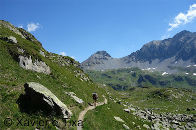 Arrumada a tralha e tomado o pequeno almoço seguimos na direcção do Col de Demècre(2361m), contornamos várias pequenas corgas, descemos para Le Dzèman(1958m) e atacamos a subida para o primeiro colo do dia, passamos no Col du Demècre(2360m) com cerca de hora e meia de caminhada, nesta fase a paisagem já nos é familiar e avançamos a um bom ritmo, perdemos 230m de desnível até passar no lago Sup. de Fully(2130) e voltamos a subir 300m até ao Col de Fenestral(2453m), o segundo colo do dia, isto deviam de ser umas 11 da manhã, durante os próximos kms não voltaríamos a subir mas ainda só tínhamos vencido metade do desnível do dia.