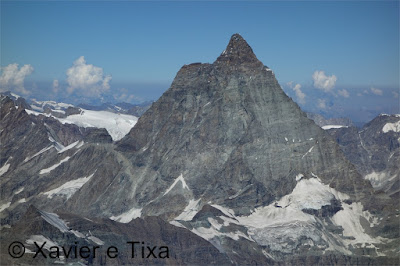 Entretanto iniciámos o regresso, tínhamos 2500m de desnível a descer até Zermatt(1616m), descemos pelo mesmo caminho e passamos novamente no plateau do Breithorn e no plateau Rosa onde descemos para Testa Grigia(3480m), passando pela zona das pistas de ski, almoçámos por ali com uma vista colossal para o Matterhorn, como durante todo o percurso.