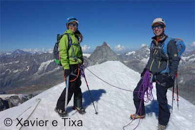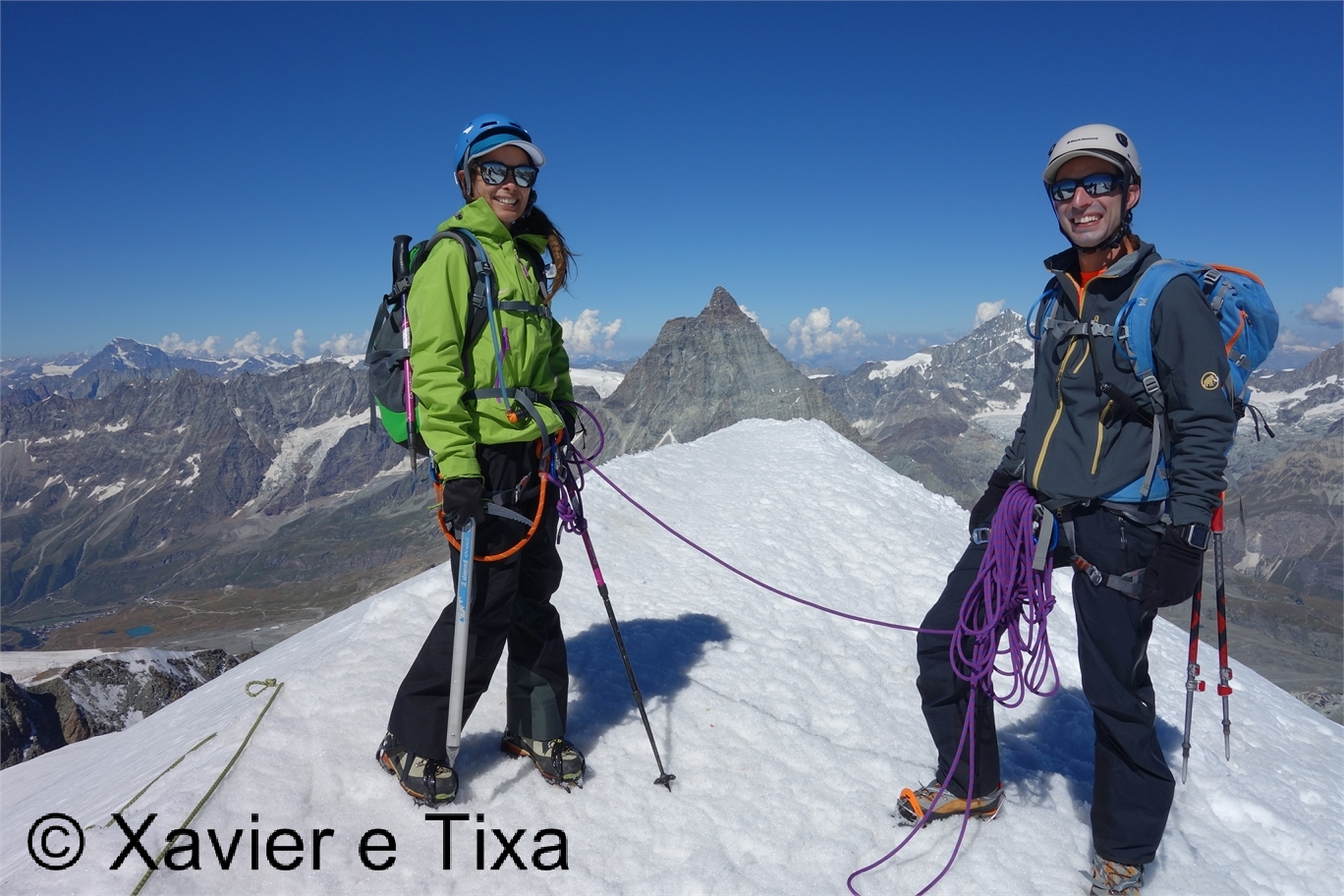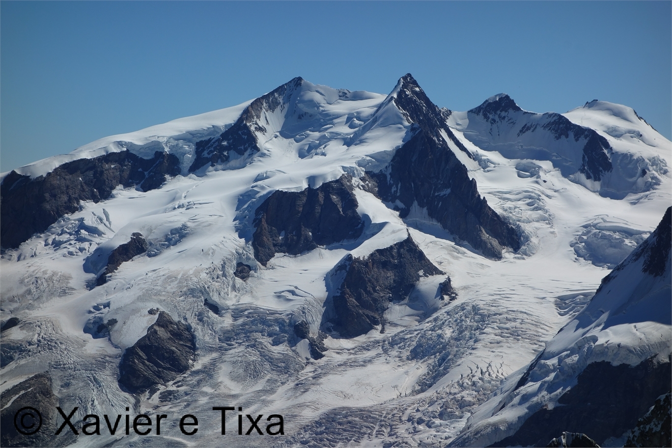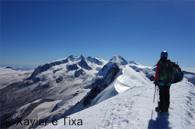 O cenário estava escandaloso e os outros alpinistas andavam todos bem dispostos, felizmente a leve dor de cabeça já tinha desaparecido, pelo que mesmo aos 4000m e uma vez mais, ficámos no pico mais de uma hora, são vários os gigantes dos Alpes que se mostram, Mont Blanc, Matterhorn, Monte Rosa, Weisshorn, Zinalrothorn, Ober Gabelhorn, Dent Blanche, só para citar alguns. A temperatura estava ideal, talvez demasiado quente para andar em glaciares, um simples casaco chegava para estar ali parado durante bastante tempo, estava-se bem aos 4000m.