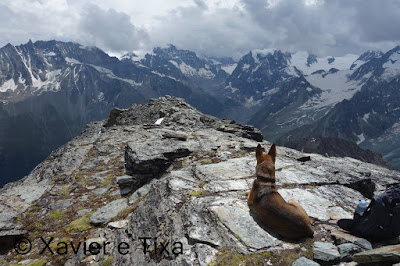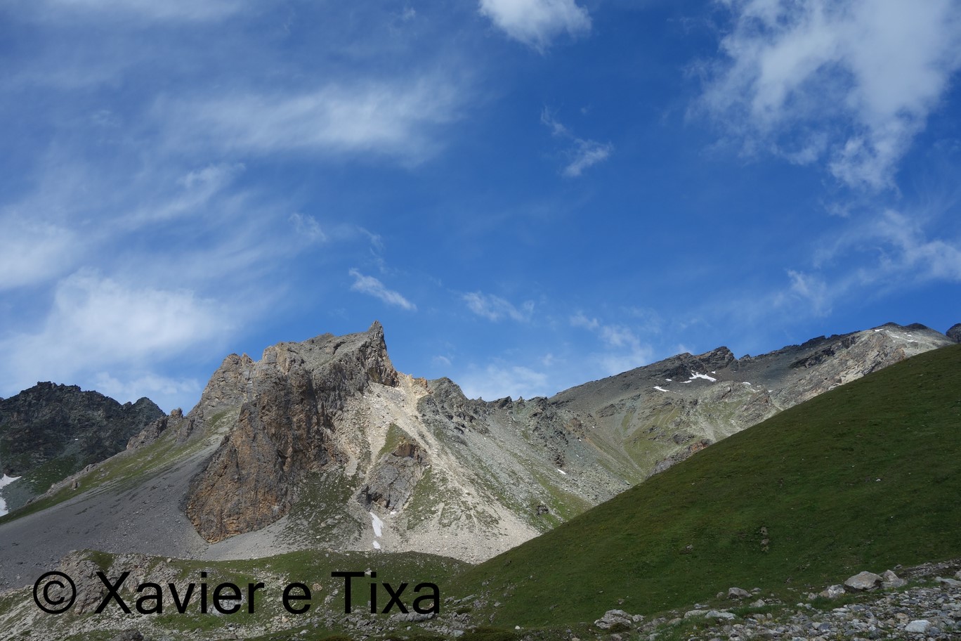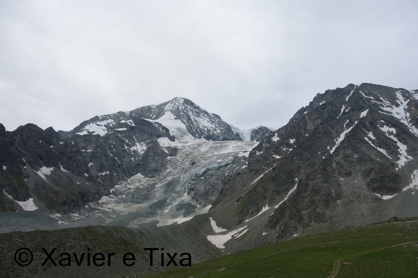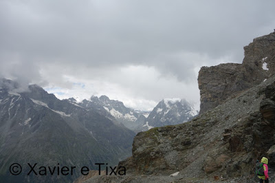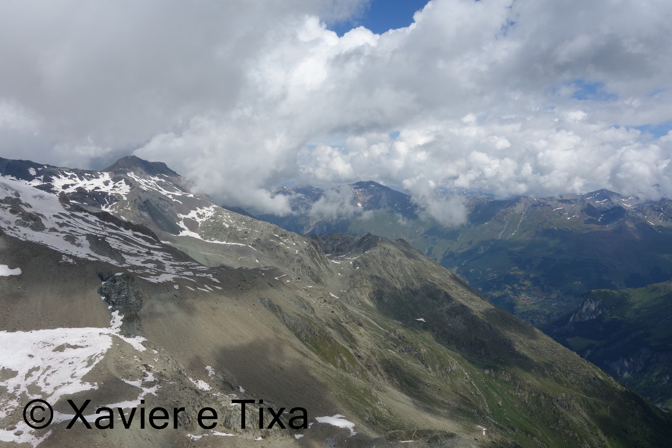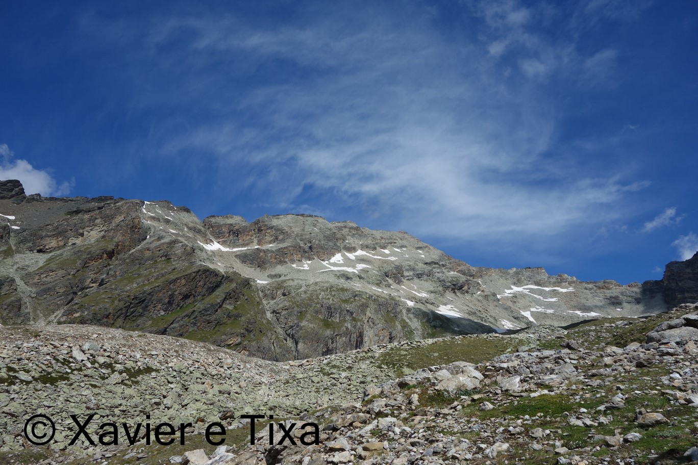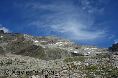 De Arolla subimos pelas pistas de ski até aos 2500m, altura em que flectimos à direita rumo ao vale Les Fontanesses, seguimos os teleféricos até ao ponto 2874m onde terminam, aqui começam as coisas sérias, primeiro tentámos identificar por onde passaria o caminho, não existe trilho e também não vi mariolas, atacamos então o largo corredor entre os picos Mont Gitsa e o La Roussette, a progressão não é evidente, por volta dos 3050m a Tixa não se sentia à vontade, sobretudo porque pensava na descida.
