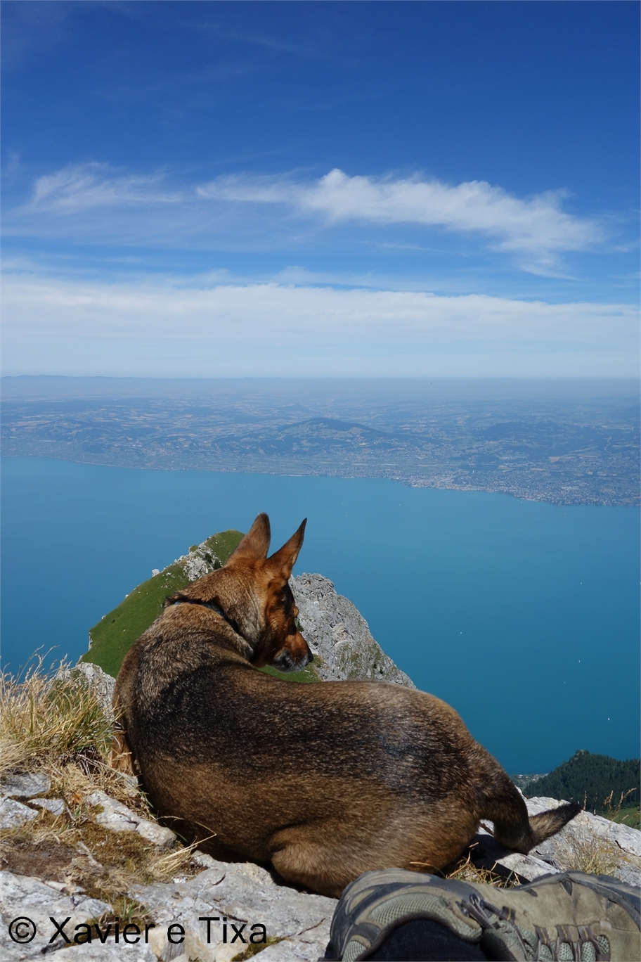 Continuo pela encosta do Le Grammont por um trilho sem desnível que vai de encontro ao estradão um pouco mais à frente, no estradão retomo a subida, pouco depois passo no Col des Crosses(1971m), volto a passar no sopé do Le Grammont agora pela encosta a Oeste, passo ao lado de uma barraca de guardar o gado e logo de seguida num pequeno colo de onde já é possível ver o Lac Léman, mais de 1500m abaixo, continuo para a direita sendo a subida final para o Le Grammont(2172m), chegado ao Le Grammont fiquei uma vez mais pasmado com a espetacularidade da vista, é agora ainda mais fácil identificar bem ao longe picos importantes dos Alpes a Este, Eiger, Monch, Jungfrau e Matterhorn, mais próximos e a Sul o Mont Blanc, Dents du Midi, Grand Combin entre tantos outros, a O a continuação do Chablais que bordeia o lago e a N o Lac Léman ali mesmo ao lado, impressionante, almocei por ali e a Xarah acompanhou-me numa turbo siesta (sesta de 15 minutos).