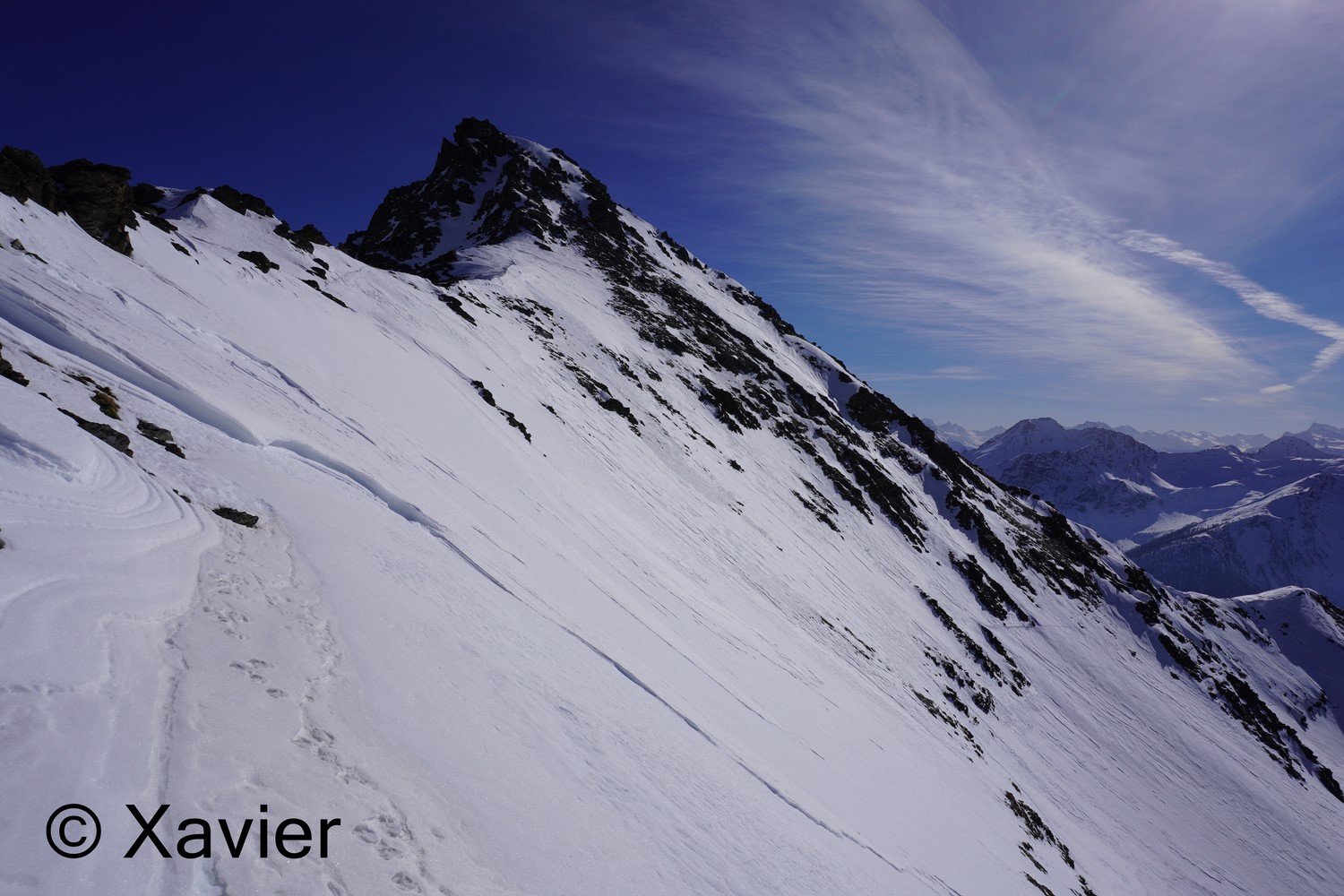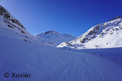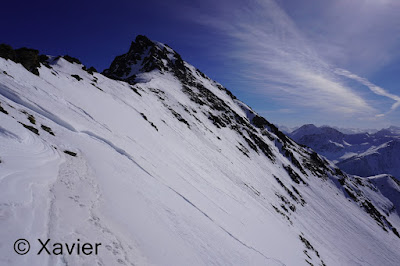 I start by heading to the normal route to Col Grand St Bernard, it was windy, at 2250m the route to Grand St Bernard turns West, i continued South and entered the Barasson Combe, at the end of the combe i saw a group of 8/9 ahead of me, they were heading also to Pointe de Barasson, at some point i saw that they were already equipped with "knifes" to the skis, at some points the snow was icy, the idea was to join Arête de Tcholeire and join the summit on foot by the north ridge, but i saw that the group was already struggling to climb, so, at 2700m i approached the West face of Pointe de Barasson, took off my skis and climb directly the West face, a fall in that section means a serious injury, i joined the southwest ridge at about 2850m, no more danger from that point until reaching the summit, colossal views from the Pointe de Barasson(2962m), to the Mont Vélan and to Mont Blanc mountains.